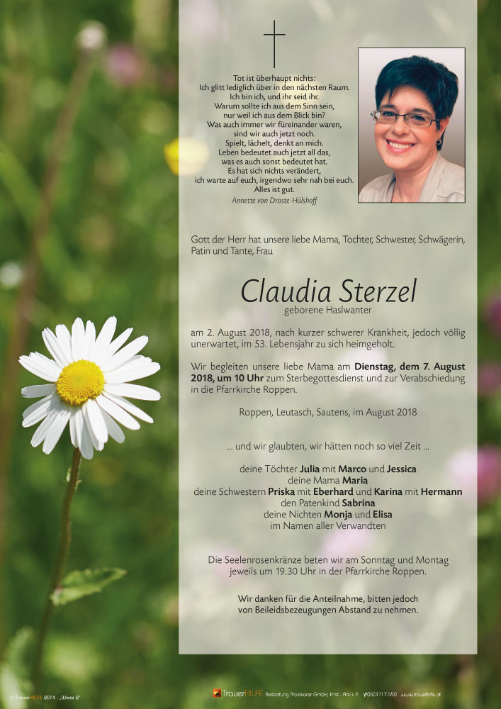 Liebe Jessie, liebe Julia! Wir trauern mit euch um eure lb Mama. Wir sind sehr erschrocken über ihren plötzlichen Tod und den schweren Verlust, den ihr erlitten habt. Claudia war eine sehr liebenswerte und von mir geliebte Cousine. Leider hat uns das Leben auf getrennte Wege geschickt. Wir haben sie und euch gerne eine lange Zeit begleitet und Freude und Schmerz mit euch geteilt. Es gab Zeiten, in denen uns ihre liebenswerte Persönlichkeit viel Freude bereitet hat. Sie hat euch sehr geliebt. Leider mehr als sich selbst. Und jetzt hat der Wind ihre unruhige Seele in die Weite des Himmels getragen. Möge sie dort ihre Ruhe finden, die sie auf dieser Welt immer gesucht und nicht gefunden hat. Es ist auch tröstlich, dass sie ihren quälenden Kampf mit ihrem Abschied von dieser Welt aufgeben konnte. Wir sind sehr traurig und sind in Gedanken und mit dem Herzen bei euch. Fühlt euch innig umarmt.