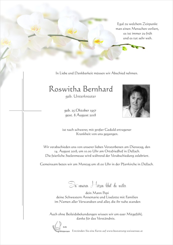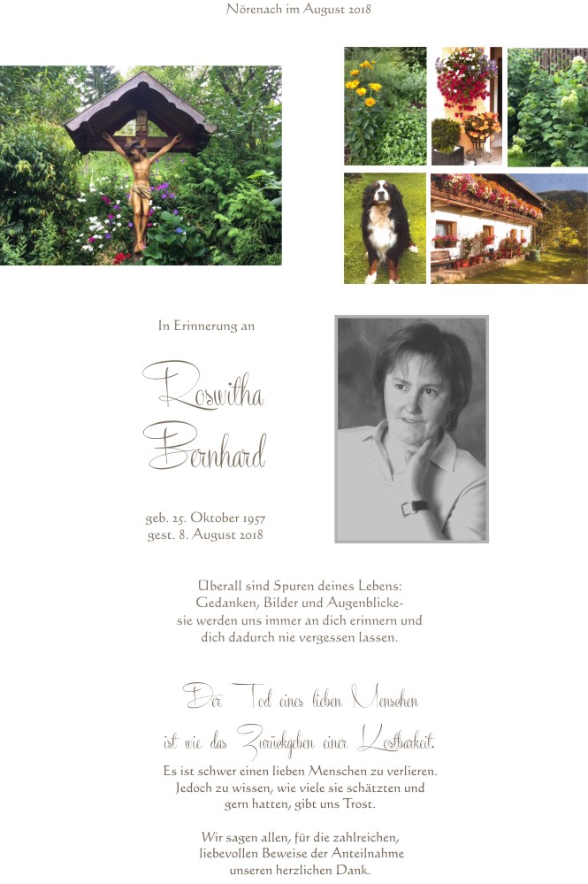 Liebe Roswitha, heute habe ich die traurige Nachricht bekommen, dich gibt es nicht mehr! Ich kann es nicht glauben. Wo ist die Zeit geblieben? Wir beide waren in inserer Jugend jeden Tag zusammen. Wir lernten uns gegenseitig "tanzen"! Ich nahm Anteil, als du deinen Pepi kennen und lieben gelernt hast. Dann hat uns das Leben getrennt! Roswitha ruhe in Frieden! Ich vergesse unsere gemeinsame, wunderschöne Zeit "nie"! Deine Jugendfreundin Pauline.