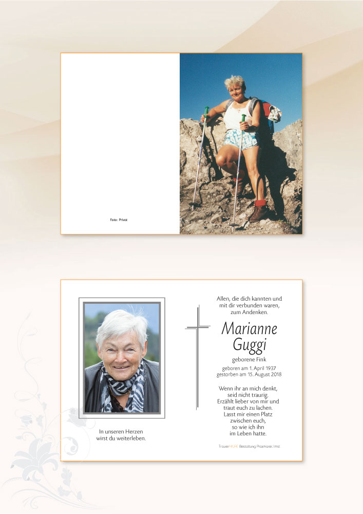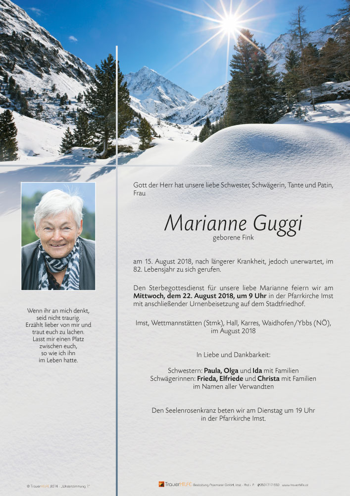 Am Heimgang Eurer lieben Marianne möchten wir Euch allen unser aufrichtiges Beileid aussprechen! Möge Euch der Herrgott viel Kraft schenken in dieser schweren Zeit! Wir werden Marianne stets in lieber Erinnerung behalten!