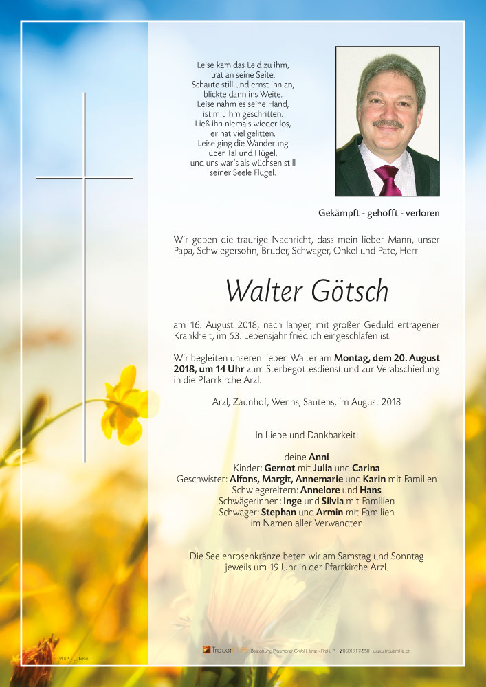 Erst heute, am 20. August habe ich von Walters Tod erfahren. Durfte ihn vor vielen Jahrzehnten einige Jahre seiner Hauptschulzeit begleiten und habe ihn heute noch als freundlichen, lieben, hilfsbereiten und fleißigen Schüler in Erinnerung. - - Herzliches Beileid der Trauerfamilie!