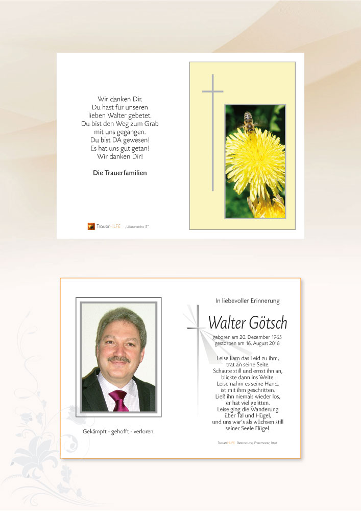 Ich durfte sein Wegbegleiter und Schulfreund über mehrere Jahre sein, und wir verbrachten in unserer Kindheit unzählige gemeinsame Stunden und Tage. Später trennten sich unsere Wege privat und beruflich, trotzdem verloren wir uns nie aus den Augen. Walter war ein Kämpfer, er war ein Mensch der sich für seine Familie aufopferte und immer für andere da war. Er war ein Mensch der immer positiv dachte und nie verzagte, obwohl er viele Schicksalsschläge in seinem viel zu kurzen Leben hinnehmen musste.