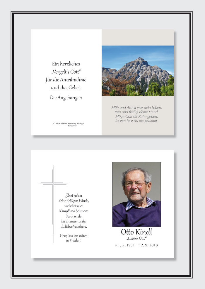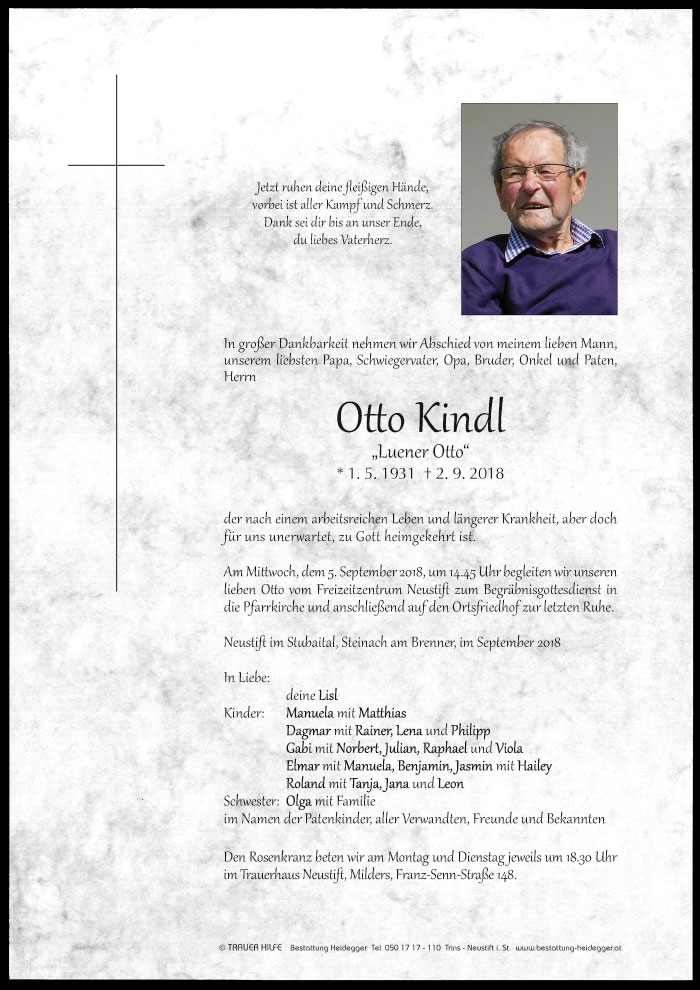 Bestattung wurde durchgeführt von: Karl Neurauter Karl Neurauter Bestattung Heidegger Brennerstraße 69 6150 - Steinach am Brenner Tel.: 05275 5211 zum Bestatter