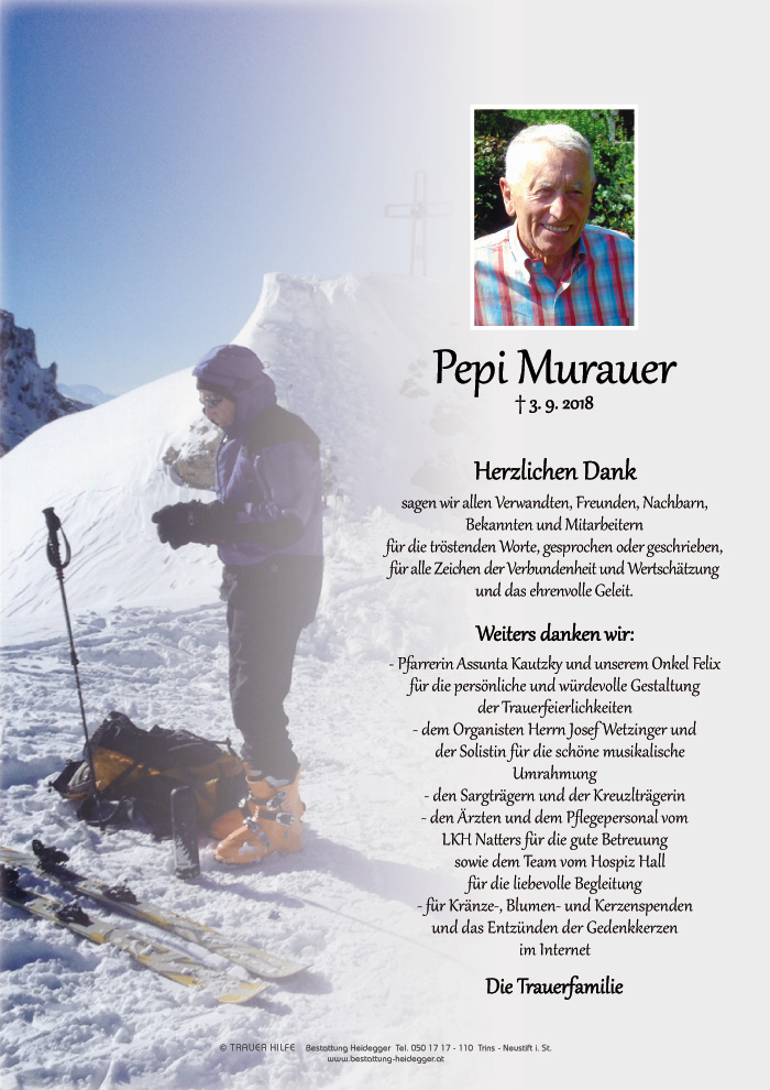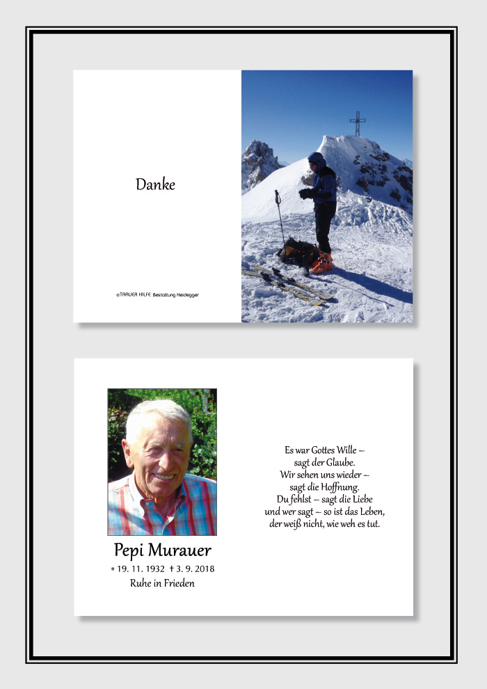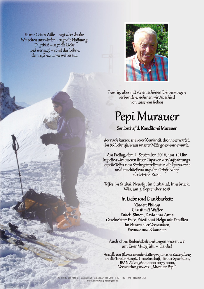 Bestattung wurde durchgeführt von: Karl Neurauter Karl Neurauter Bestattung Heidegger Brennerstraße 69 6150 - Steinach am Brenner Tel.: 05275 5211 zum Bestatter
