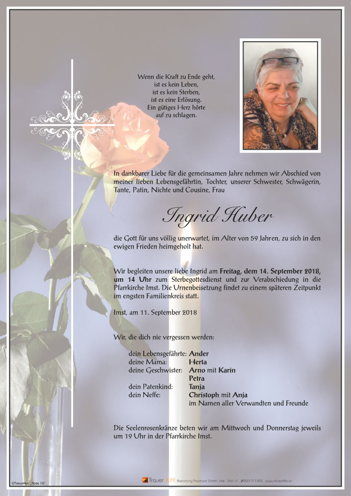Der Trauerfamilie wünsche ich viel Kraft für die schwere Zeit des Abschieds. Möge Ingrid in Frieden ruhen.