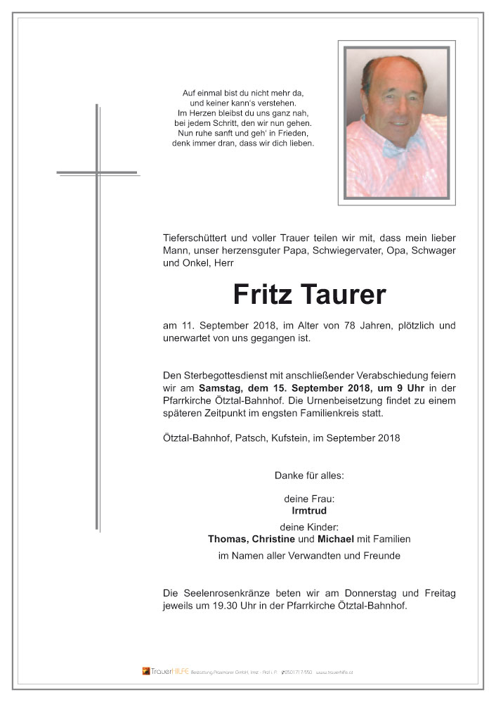 und möchten euch unser aufrichtiges Beileid zu eurem schmerzhaften Verlust ausdrücken. Wir werden Fritz in lieber Erinnerung behalten.12.09.2018 21:24 - Albert und Maria Pöll Scheffau
