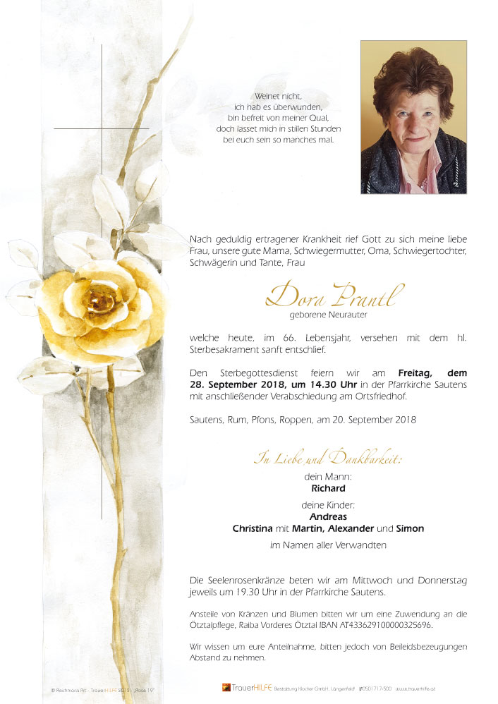 Liebe Trauerfamilie ich entbiete mein aufrichtiges Beileid wünsche Allen viel Kraft in dieser schweren Zeit! Ich habe Dora im Pflegeheim in Längenfeld näher kennen gelernt, sie ist mir sehr ans Herz gewachsen, hat viel für Andere gegeben und getan, dichterisch hat sie mit Humor vieles umschrieben. So auch zu meiner Hochzeit im August, das meine Enkelin allen Hochzeitsgästen vorgetragen hat, hat" Alle" zum Schmunzeln gebracht. Ich werde Dora immer in guter Erinnerung behalten in Liebe deine Pflegerin Christine und Valentin.21.09.2018 12:22 - Christine ( Agerer) und Valentin Plangger Imst