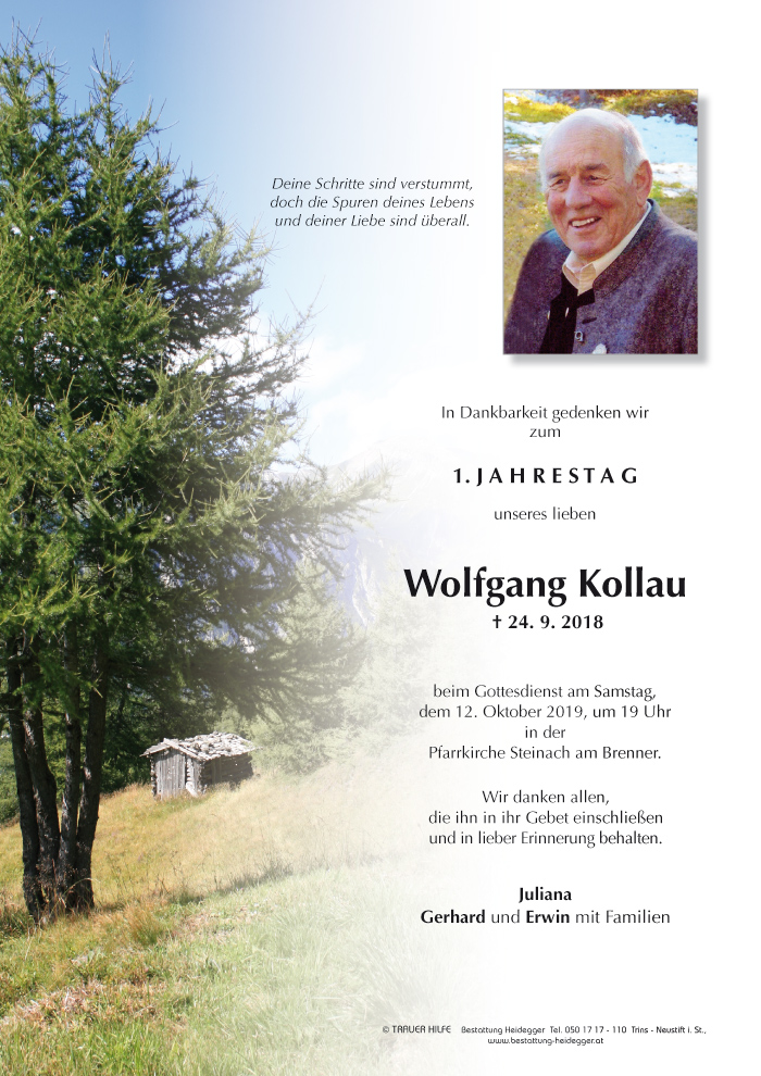 Bestattung wurde durchgeführt von: Karl Neurauter Karl Neurauter Bestattung Heidegger Brennerstraße 69 6150 - Steinach am Brenner Tel.: 05275 5211 zum Bestatter