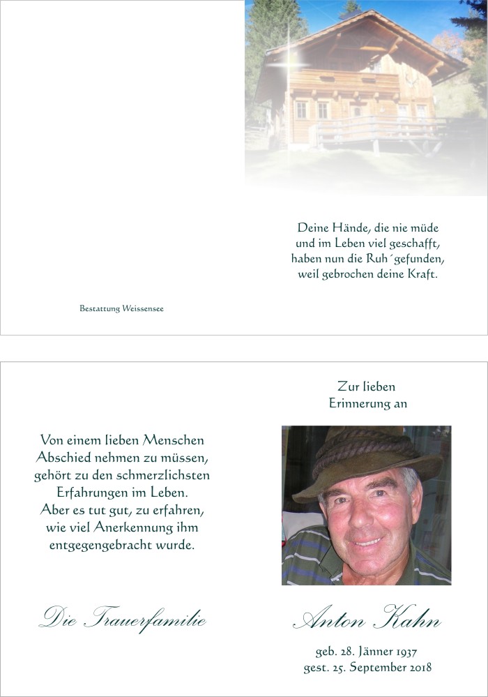 Bestattung wurde durchgeführt von: Markus Ertl Bestattung Weissensee Neusach 26 9762 - Weißensee Tel.: 04713 22 29 zum Bestatter
