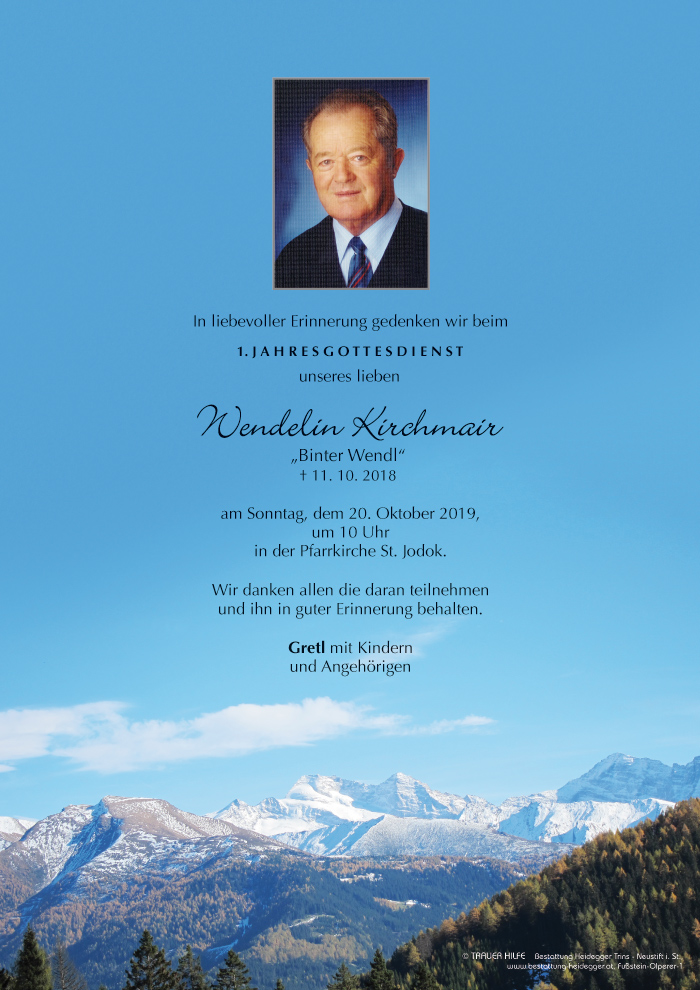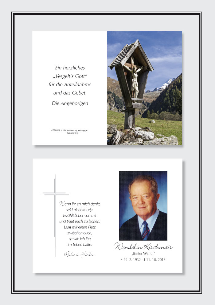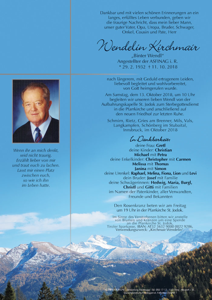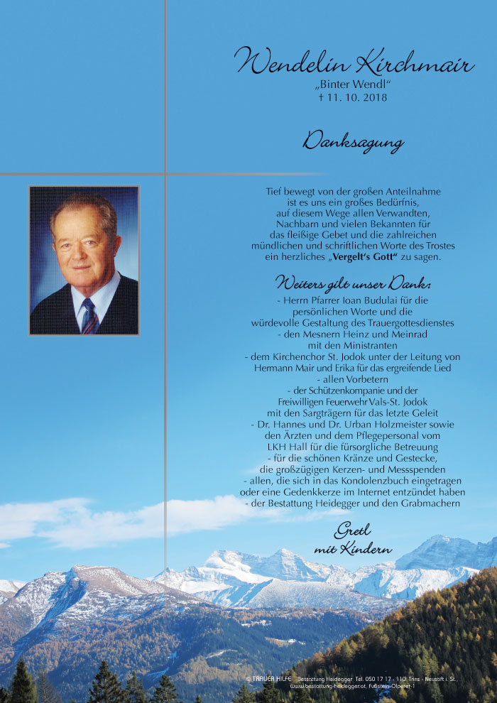 Bestattung wurde durchgeführt von: Karl Neurauter Karl Neurauter Bestattung Heidegger Brennerstraße 69 6150 - Steinach am Brenner Tel.: 05275 5211 zum Bestatter
