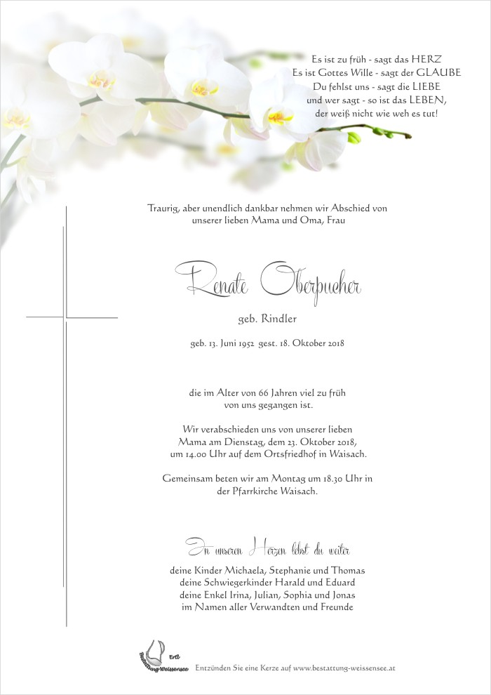 Bestattung wurde durchgeführt von: Markus Ertl Bestattung Weissensee Neusach 26 9762 - Weißensee Tel.: 04713 22 29 zum Bestatter