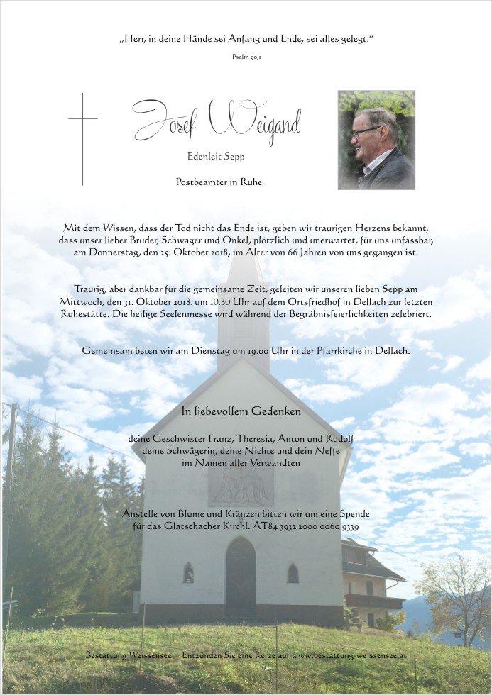 als ehemaliger Schulkollege vom Sepp (und in der VS Dellach auch vom Rudl) bin ich über dessen Ableben infolge eines tragischen Unfalls (wie mir meine Schwester Annemarie, die in Spittal wohnt, am Telefon erzählte) sehr bestürzt. Ich habe mich nämlich mit dem Gedanken getragen, noch heuer im Herbst wieder einmal bei euch vorbeizuschauen – die oft hitzigen Debatten über Gott und die Welt mit dem Sepp, denen Franz vergnügt zugehört und sich gelegentlich auch als Herr im Hause Edenleit eingeschaltet hat, wenn z.B. vom Rudl eine andere Meinung geäußert wurde, waren immer ein Highlight bei unseren leider seltenen Treffen, seit mein Dauerwohnsitz in Wien ist. Es gibt viele gemeinsame und nette Erinnerungen aus unserer Kindheit, zumal unsere Väter, der Edenleit mit dem Lanzinger Toni, gut miteinander auskamen und ich so oft beim Tratsch in der warmen Küche neben dem großen Kachelofen, wo sich immer alle aufhielten, auch in den Genuss von Kaffee und Kuchen kam, den die Edenleit-Mutter liebevoll und gekonnt servierte.