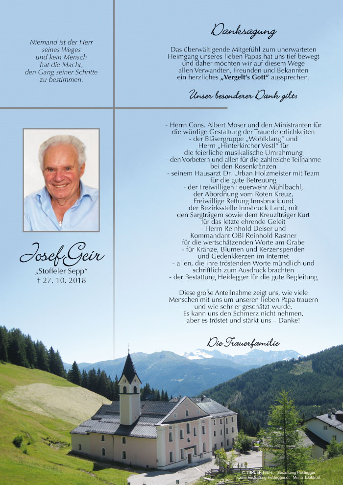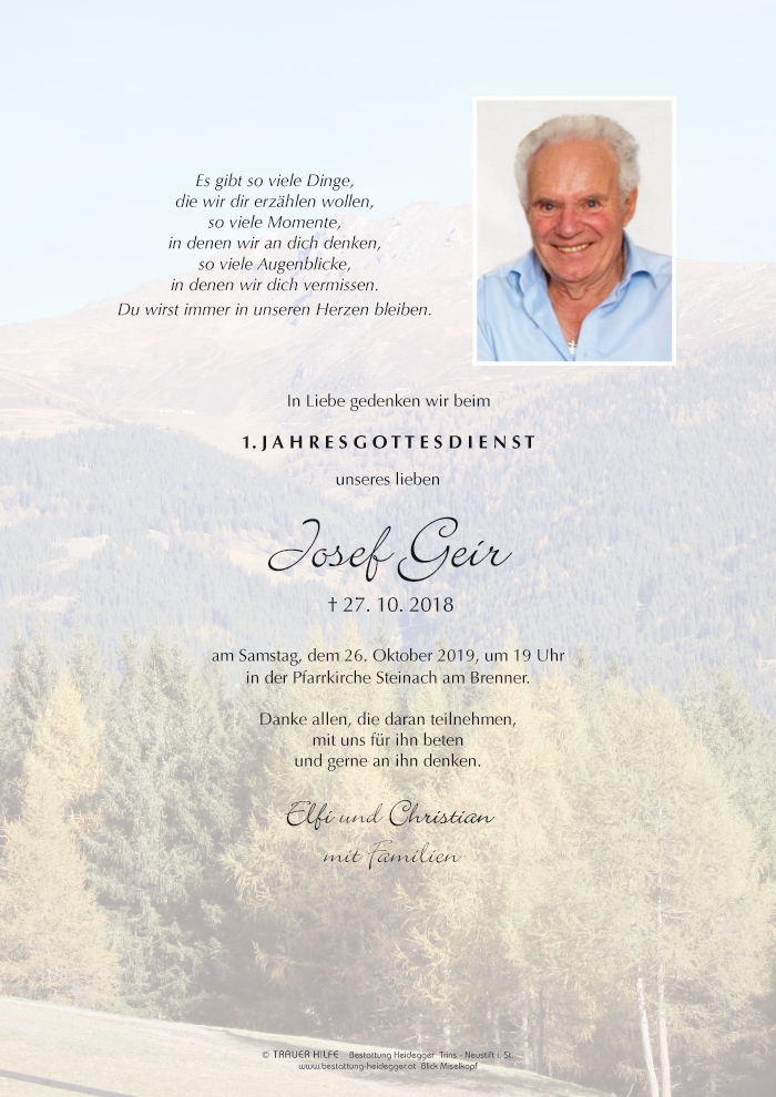Bestattung wurde durchgeführt von: Karl Neurauter Karl Neurauter Bestattung Heidegger Brennerstraße 69 6150 - Steinach am Brenner Tel.: 05275 5211 zum Bestatter