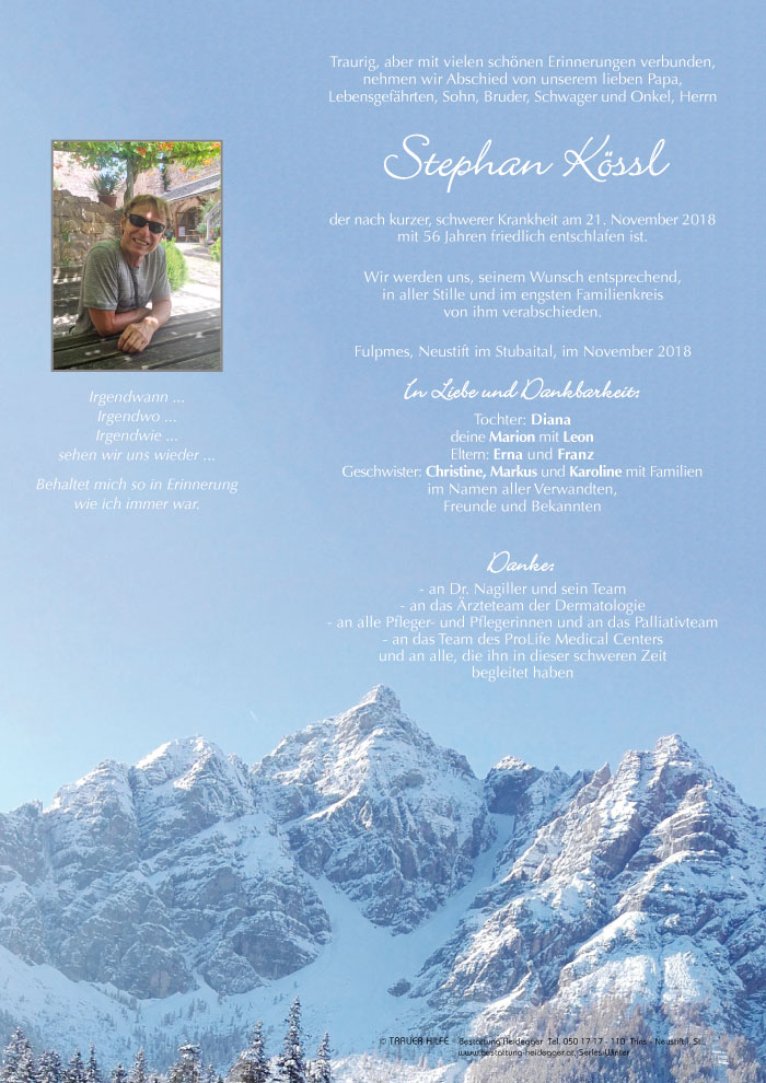 Liebe Familie Kössl, möge der Schmerz über den Verlust sie nicht erdrücken und die Erinnerung an die gemeinsame Zeit ihnen genügend Kraft für die Zukunft geben.