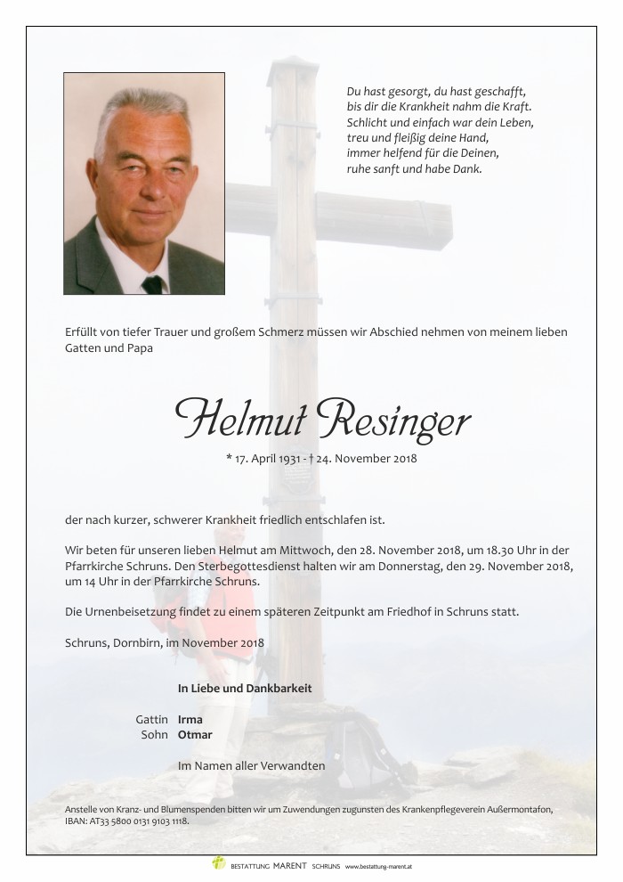 Bestattung wurde durchgeführt von: Peter Marent Bestattung Marent GmbH Gantschierstraße 80 6780 - Schruns Tel.: 05556 77070 zum Bestatter