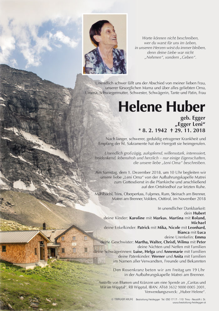 Liebe Leni du warst mir immer eine gute Freundin ich werde dich nie vergessen machs gut wir sehen uns wieder Aufrichtige Anteilnahme Lisi Oberdanner