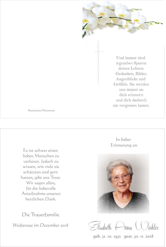 • Wer so wie Elisabeth gewirkt in ihrem Leben, wer so wie sie ihre Pflicht erfüllt hat und stets für ihre Lieben gesorgt und geliebt hat, wird für immer im hellen Licht bleiben.