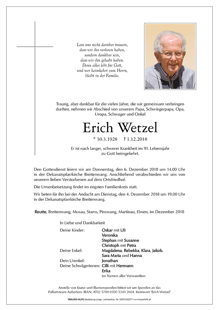 Heimgehen in die Obhut Gottes. Das schenke euch Trost im vertrauten Zusammenhalt der Familie.