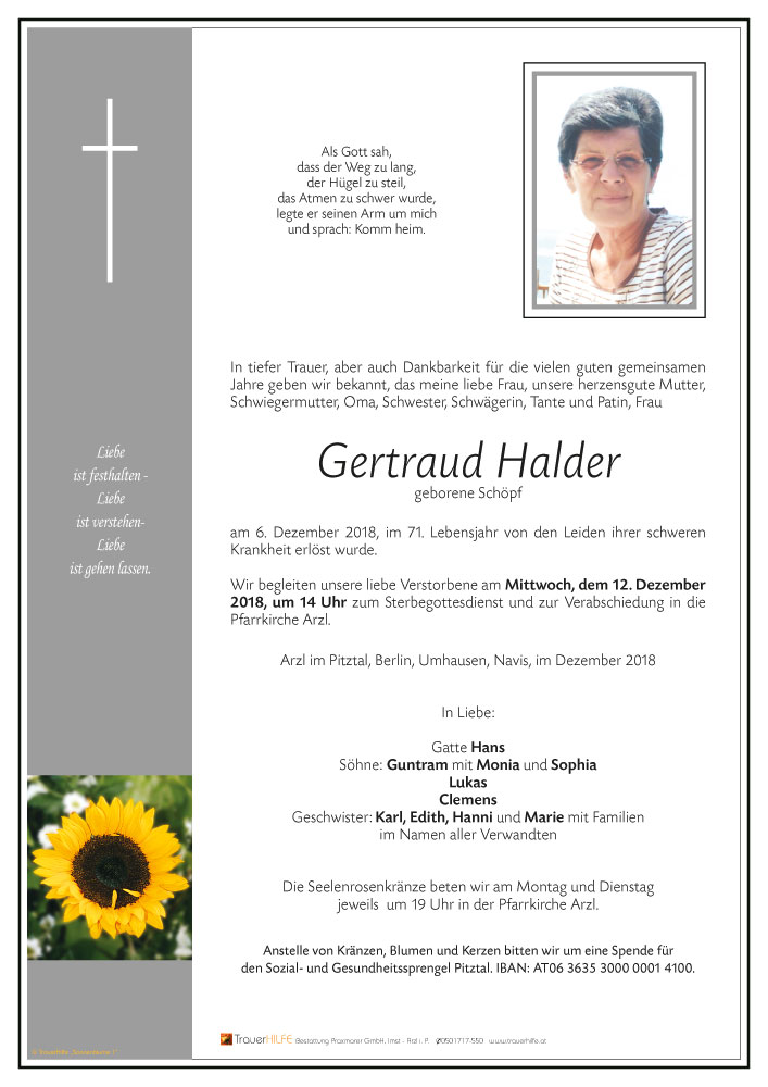 Ich wünsche dir und deiner Familie viel Kraft für die kommende Zeit. Es möge für euch tröstend sein, dass Gertraud nun von ihrem Leid erlöst wurde!