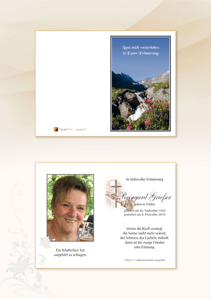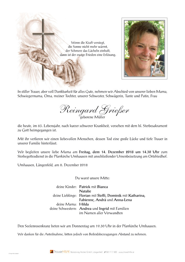 Geschätzte Trauerfamilie. Ich möchte euch in diesen schweren Stunden meine aufrichtige und tief empfundene Anteilnahme ausdrücken. Reingard wird mir als freundliche, hilfsbereite und starke Frau in guter Erinnerung bleiben.