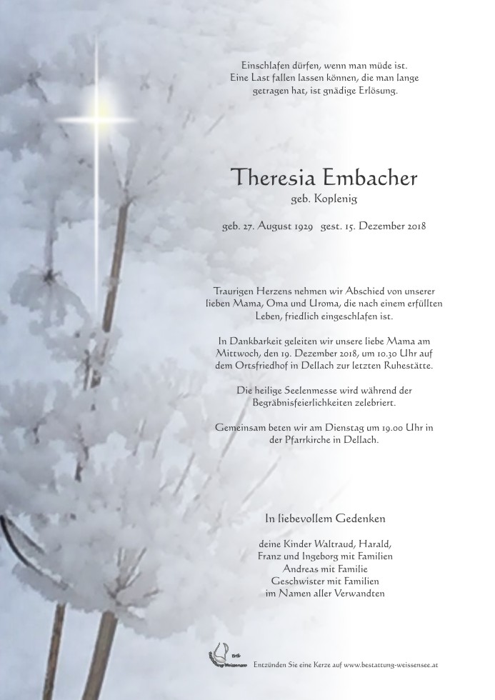 Neue Kerze für Theresia Embacher entzünden.