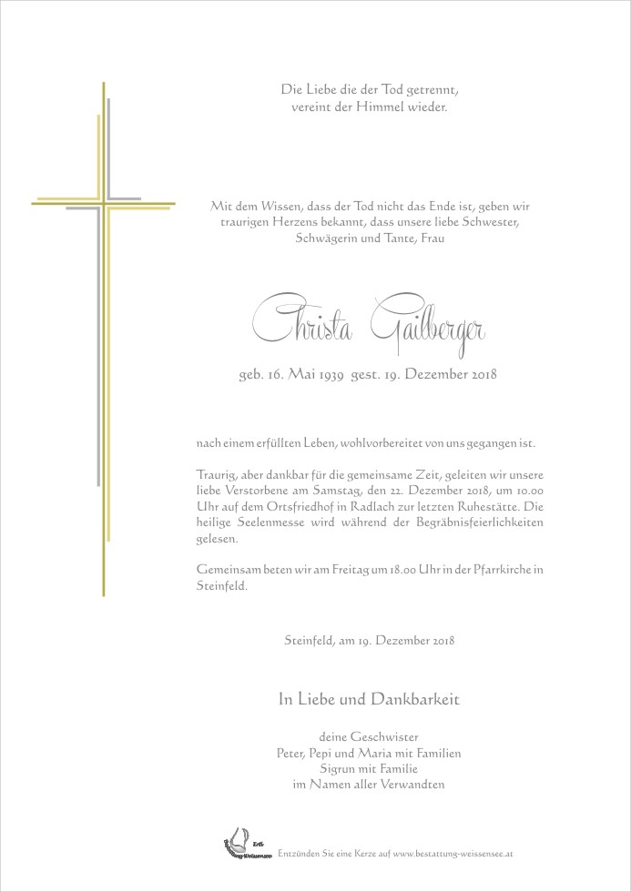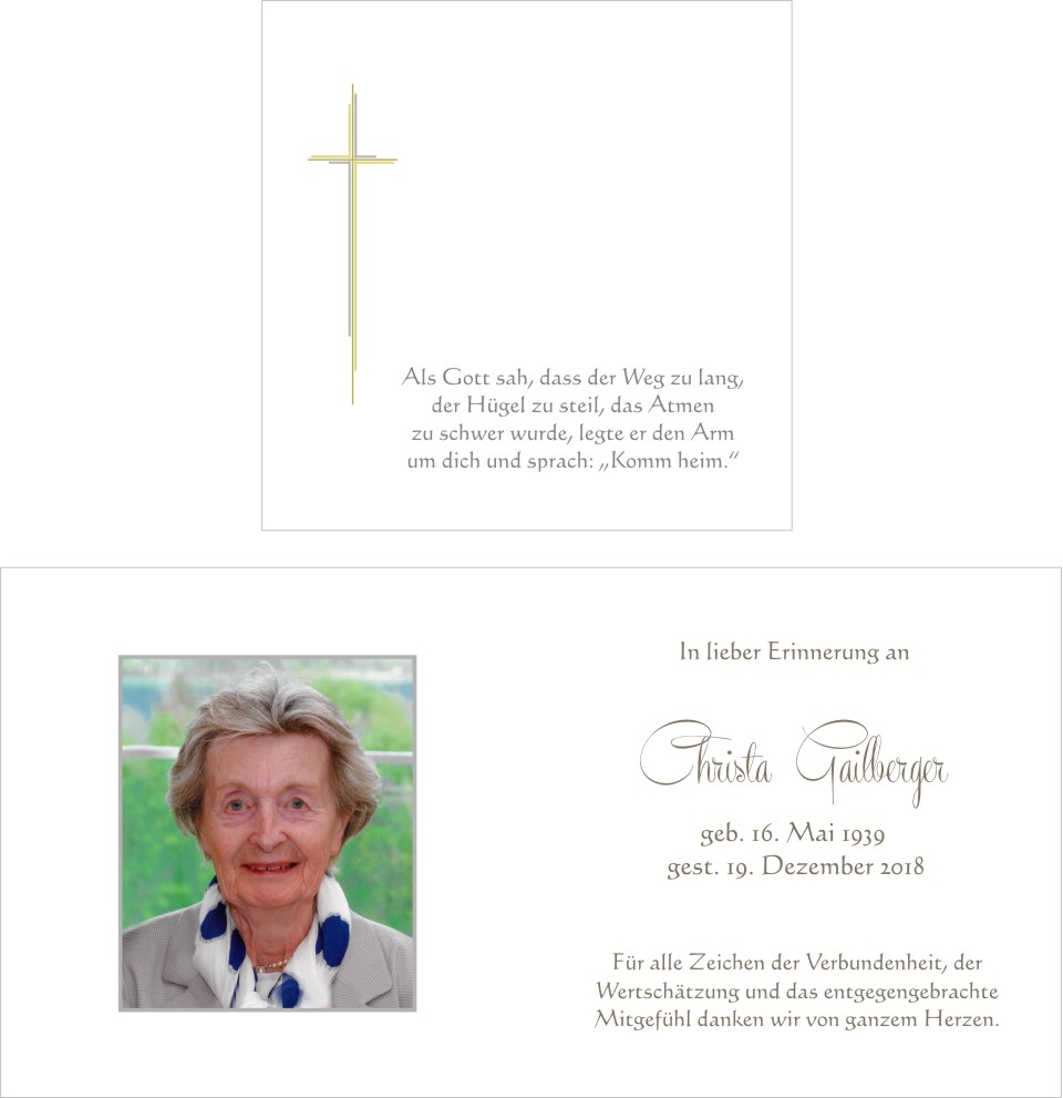 • Wer Frau Gailberger gekannt hat, wird sie in lieber Erinnerung behalten, als eine freundliche , liebenswerte Frau, der zu