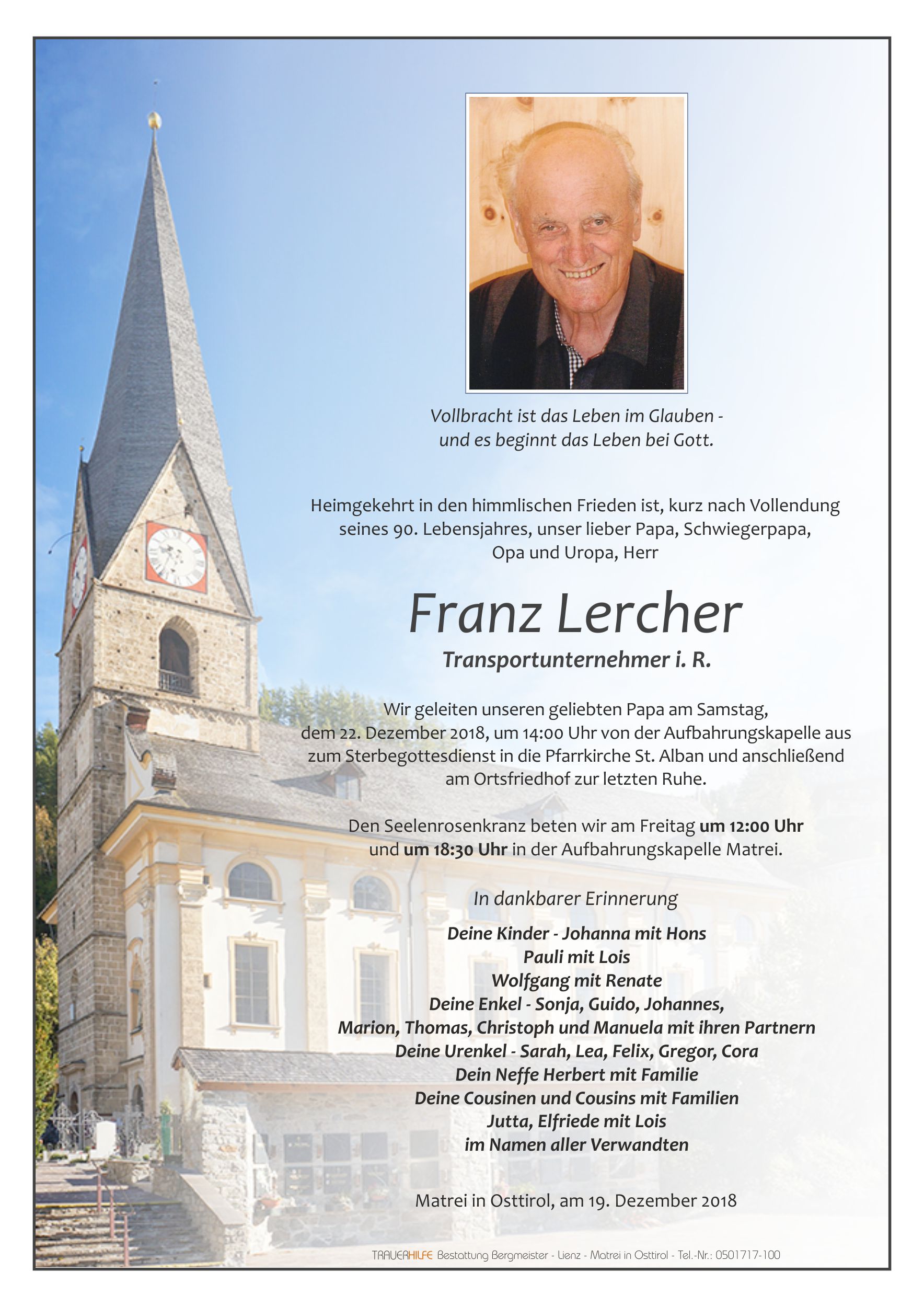Bis zum letzten Atemzug wart ihr für euren lieben Papa da und habt ihm Geborgenheit und eure Liebe geschenkt. Euer Papa war Zeit seines Lebens ein ehrenwerter Mensch dem seine Familie und die Gemeinschaft am wichtigsten waren. In diesen schweren Tagen des Abschied Nehmens wünsche ich euch viel Kraft und Zuversicht aber auch viele liebevolle Erinnerungen an eure gemeinsame Zeit.