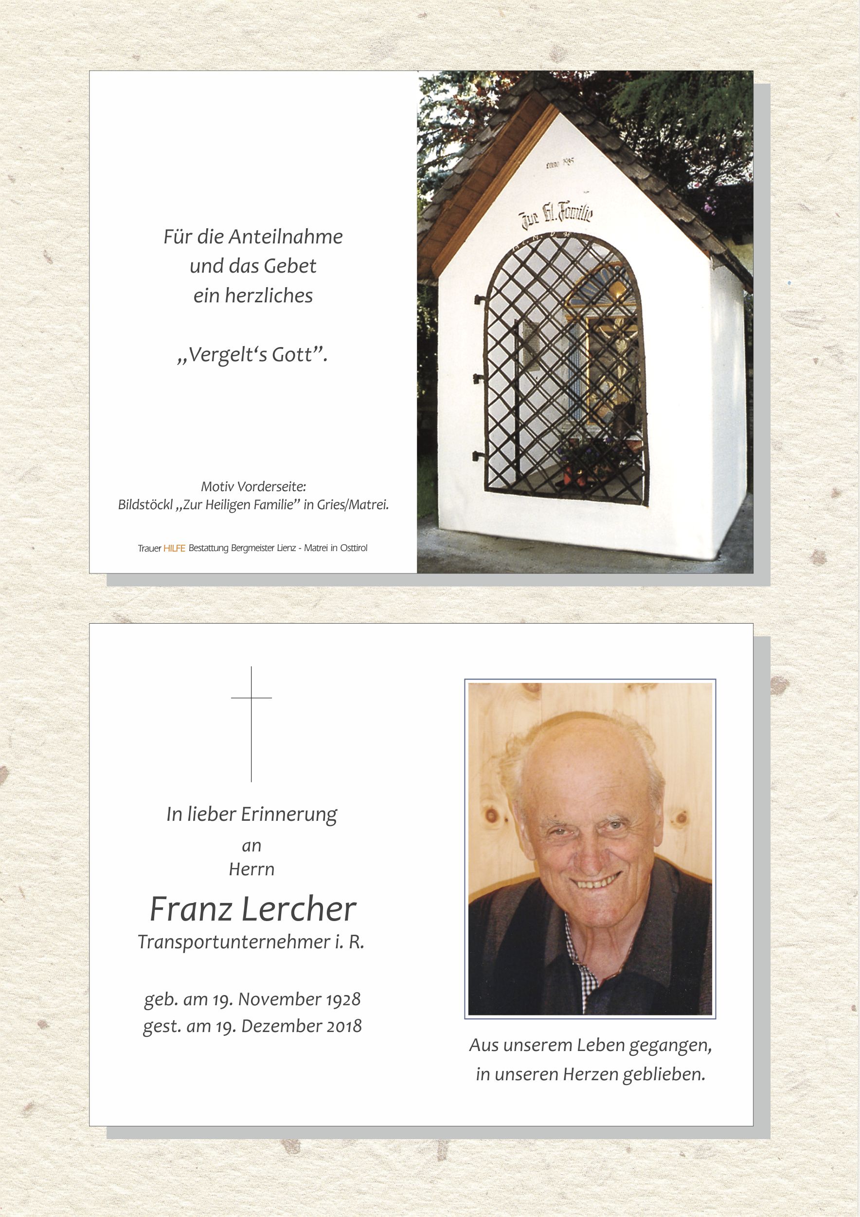 I hun it gedenkt, dass I di hitz in Mantige des leschte mol gsechen hun. Du hosch nou sou fein hergelocht und obwohl Du nemma geredet hosch, hosch Du mit dein Kopf genickt und uns asou geontwortet. Es woa a gonz a besondere Begegnung für mi, weil Du mia schun a gonze Weile ogang bisch, wenn I ins Cafe gong bin, hom mia olm mitanonda gspasst. Danke, es woa olbm fein mit Dir ze pretschn. Pfiate Franz, mochs güet, do wo Du hetz bisch und schaug fest öacha auf Deine Leitlen.