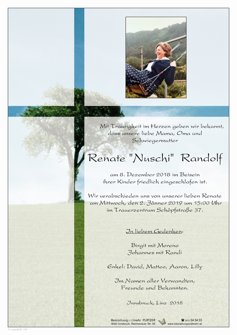 Bestattung wurde durchgeführt von: Mag. Martin Müller Concordia Bestattung 6020 - Innsbruck Reichenauer Str. 95 6060 - Hall i. T. Salzburger Str. 33 Tel.: 0512 34 34 33 Tel.: 05223 57 2 54 zum Bestatter