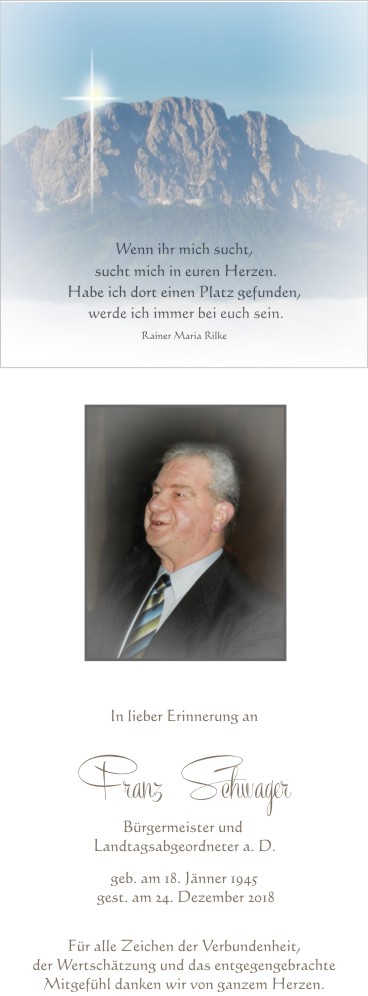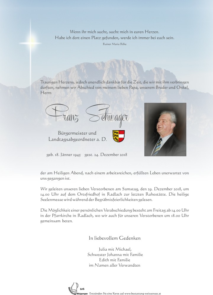 • Werte Trauerfamilie! Mit tiefer Bestürzung erfuhr ich vom plötzlichen Heimgang von Franz .