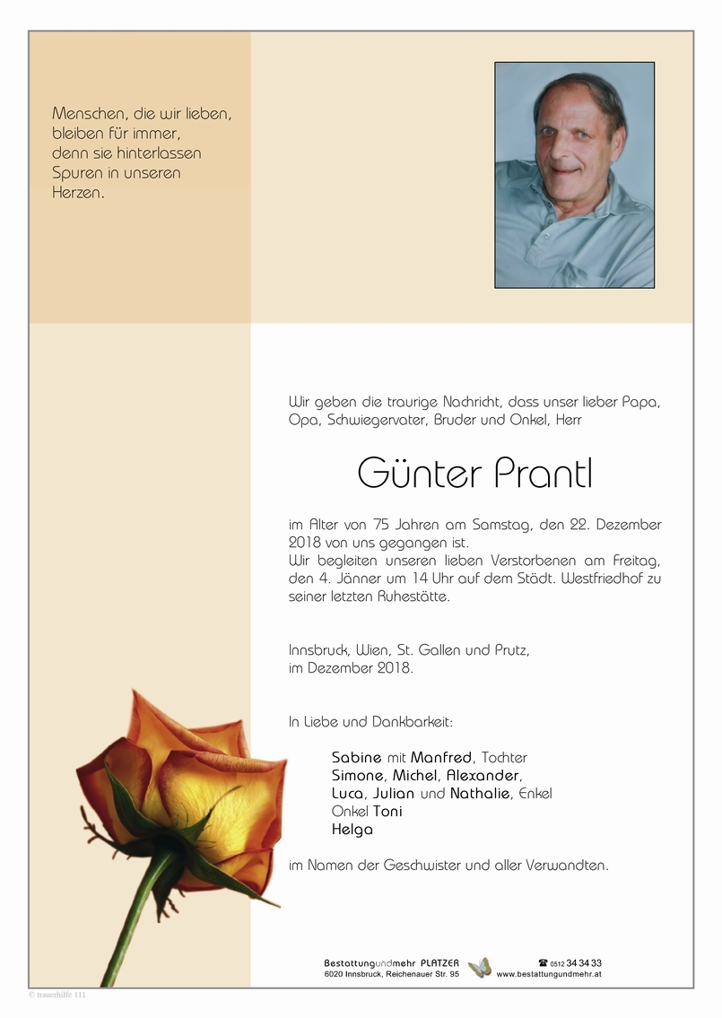 Bestattung wurde durchgeführt von: Mag. Martin Müller Concordia Bestattung 6020 - Innsbruck Reichenauer Str. 95 6060 - Hall i. T. Salzburger Str. 33 Tel.: 0512 34 34 33 Tel.: 05223 57 2 54 zum Bestatter