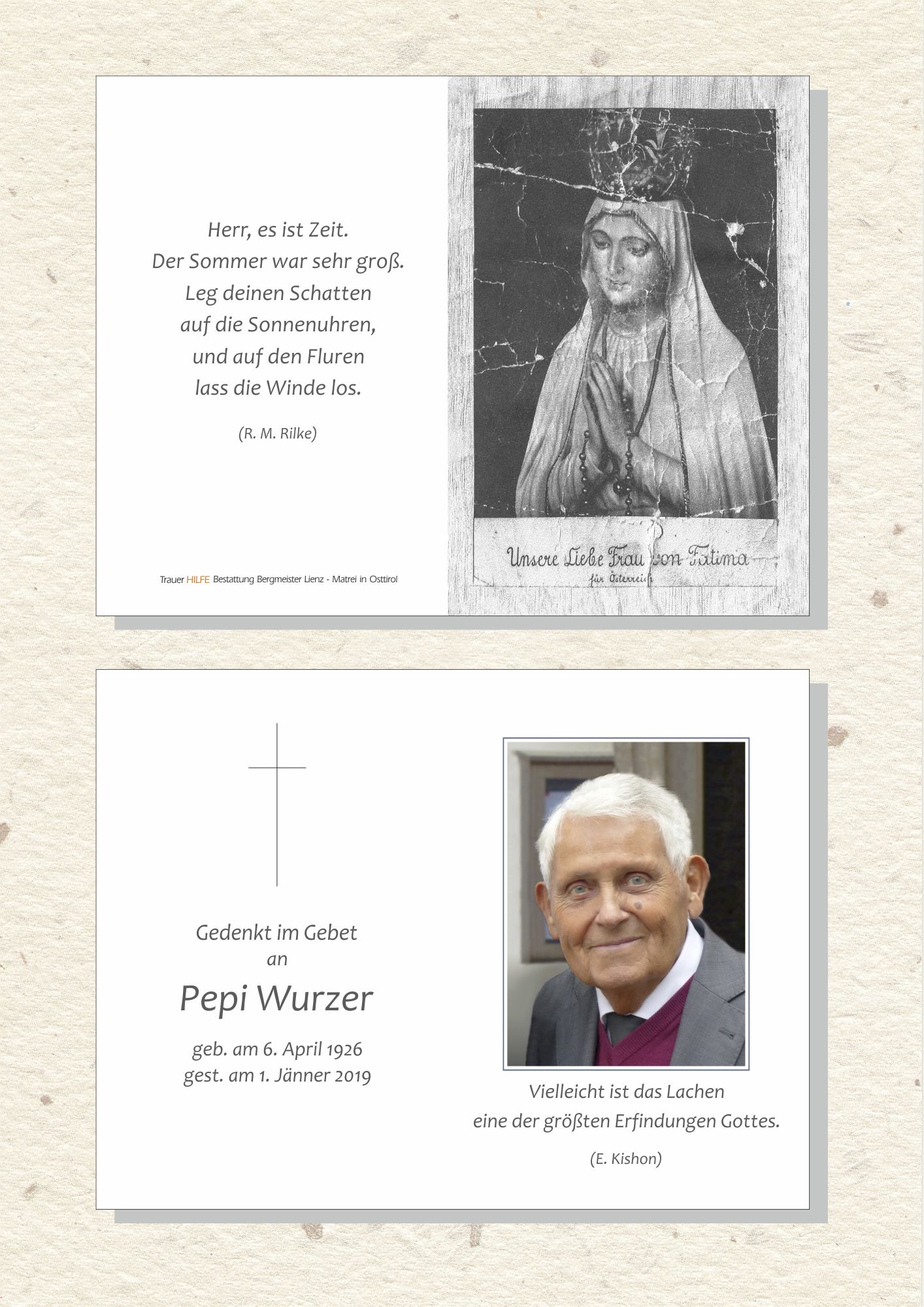 Lieber Pepi, viele Freunde und Wegbegleiter waren gestern mit dabei, beim würdig gestalteten, endgültigen Abschied von dir, in der Stadtpfarrkirche St. Andrä und nachher am Friedhof. Was zu sagen war, wurde gesagt. Und dir auch gedankt. Mir bleibt eine Begegnung vom vorigen Jahr in Erinnerung, wo du mir von deinem Vorhaben erzähltest, einen weiteren Gedichtsband zu veröffentlichen. Ich bin froh, dass ich dir einen Beitrag (stammt nicht von mir) vermitteln konnte. Ganz spontan , bei einem Glasl "Weiß", verlieh ich dir den "Doktor h. c." , sprich: "Doktor Humoris causa". Wer von uns erinnert sich nicht an Lustiges beim Beginn jeder Begegnung aus deinem reichen humorvollen Fundus? "Siegsch eh, Herr Pforrer: Sensuum defectui!" Lieber Pepi, es isch Zeit, dir jetzt endgültig Lebewohl zu sagen. Dies sagt dir, in stillem Gedenken, dein ehemaliger, langjähriger Sitznachbar, von 68 - 86, im Lienzer Gemeinderat, Franz.