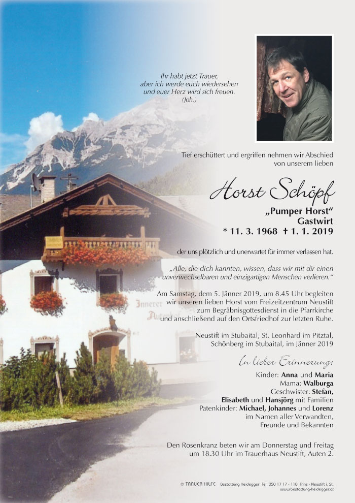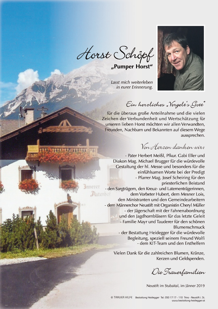 Lieber Horst ich hoffe du bist jetzt frei von aller Last und allen Sorgen! RIP Ich habe diese schweren Tage leider schon zweimal durchlebt. Man wird es nie begreifen und kann es nur mit vielen lieben Menschen gemeinsam durchstehen. Irgendwann lernt man damit umzugehen aber es schmerzt immer! Viel Kraft und Zusammenhalt für diese schwere Zeit!