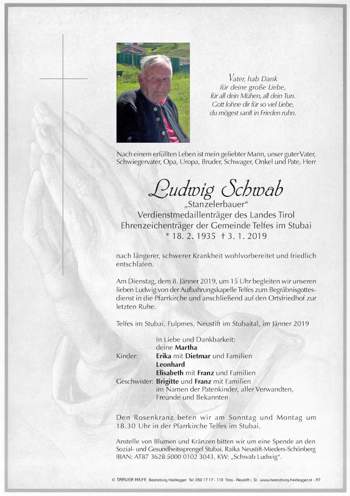 Friedhof Telfes im Stubaital, † 03.01.2019 (83 Jahre)