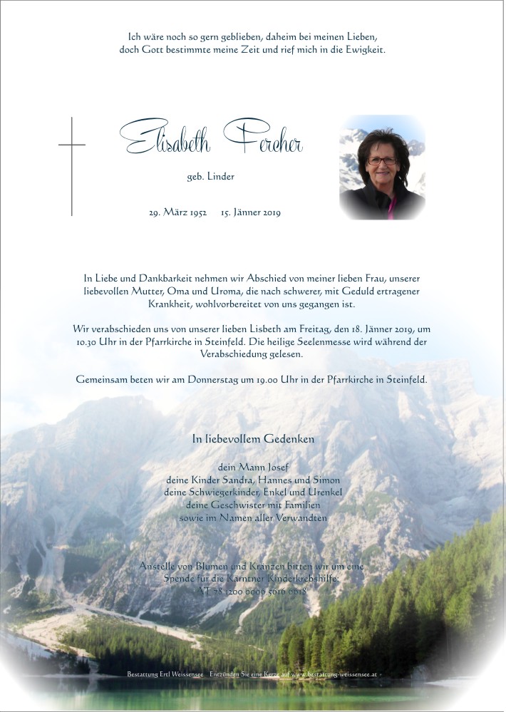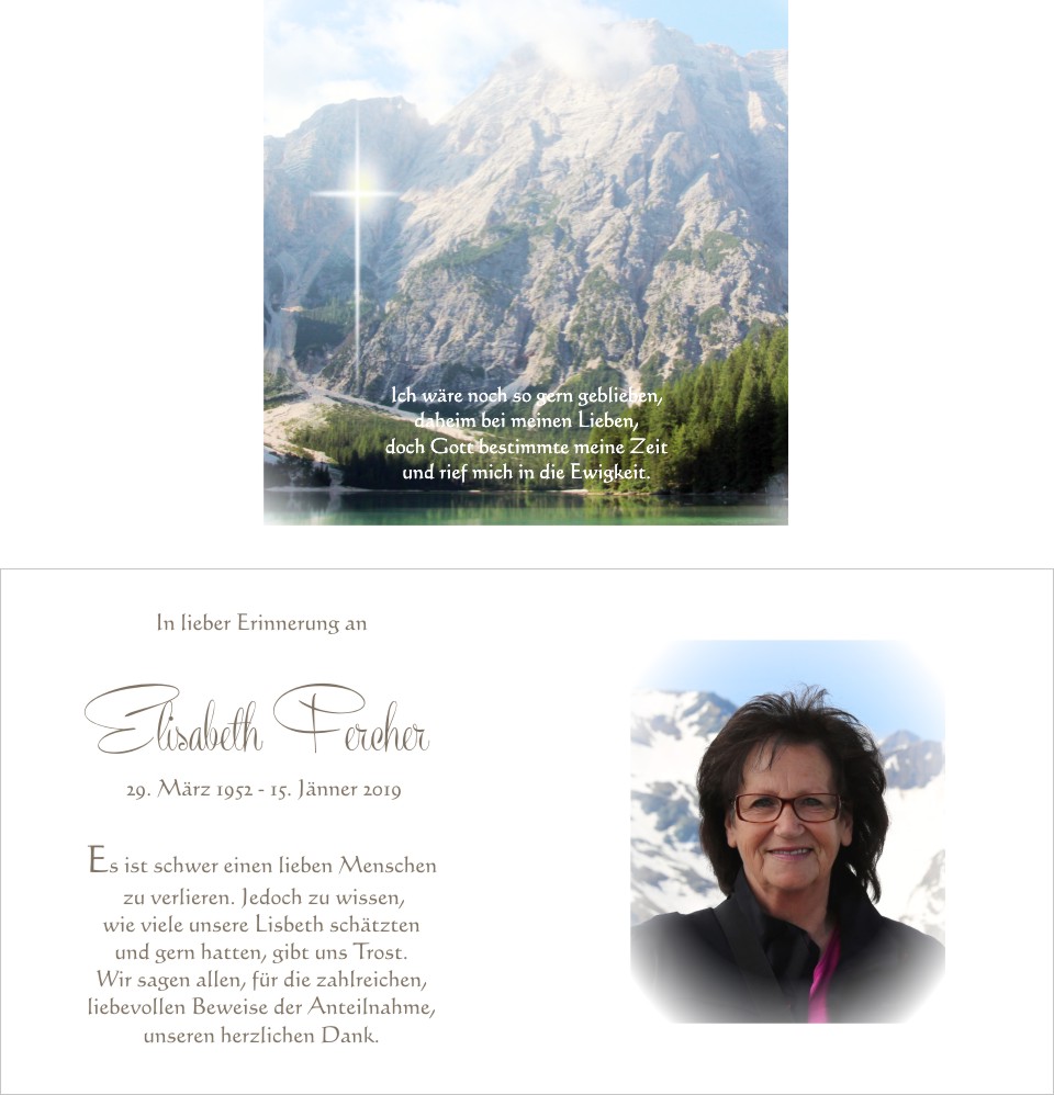 Zum Ableben eurer Lisbeth bzw. eurer Mama möchten wir Euch unser aufrichtiges Beileid aussprechen und wünschen Euch viel, viel Kraft für die kommende Zeit! Pfiat di Lisbeth und ruhe in Frieden! Edith und Fritz
