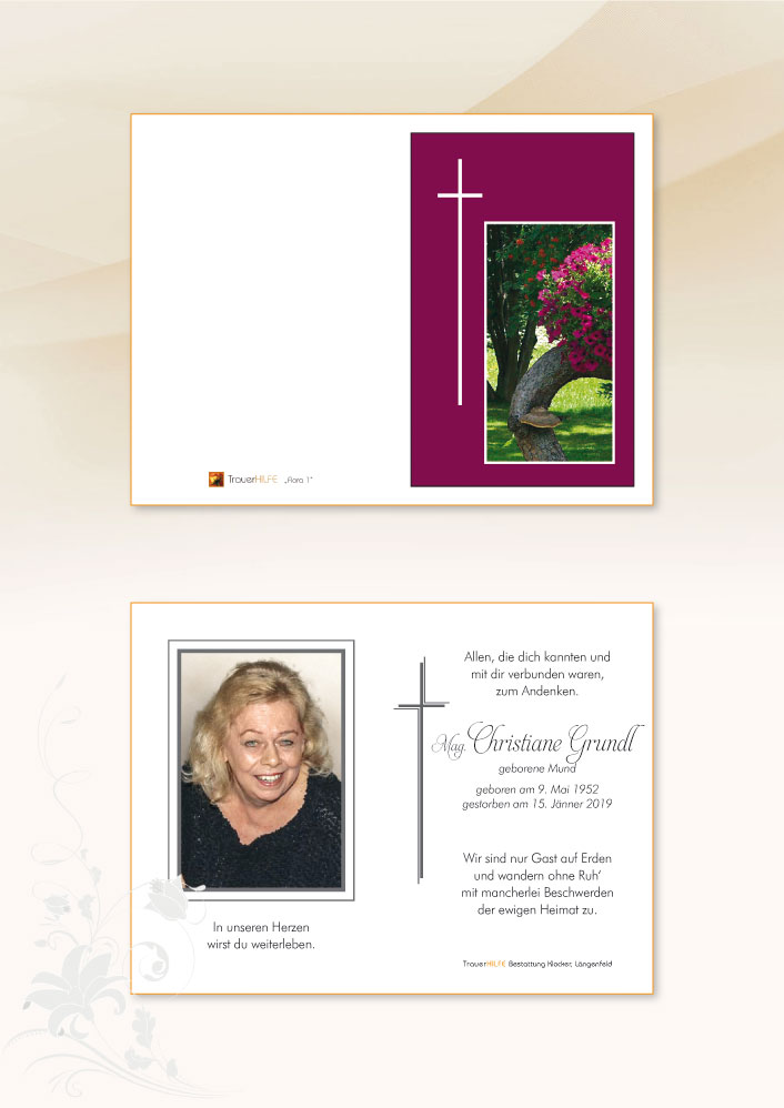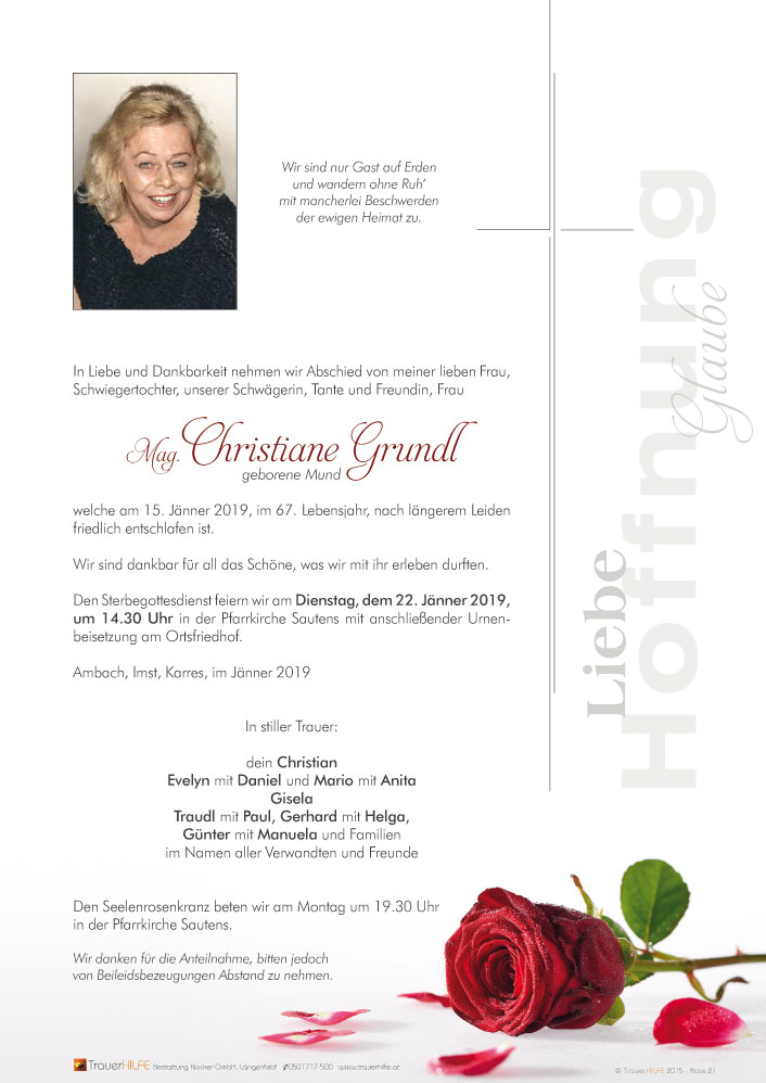 • Lieber Christian, geschätzte Trauerfamilie. Mit Christine verbinden uns schöne Erinnerungen und unterhaltsame Stunden. Sie bleibt uns in guter Erinnerung.