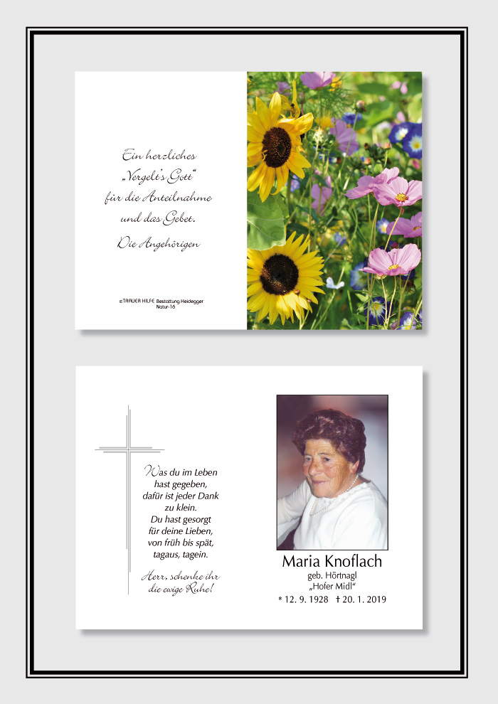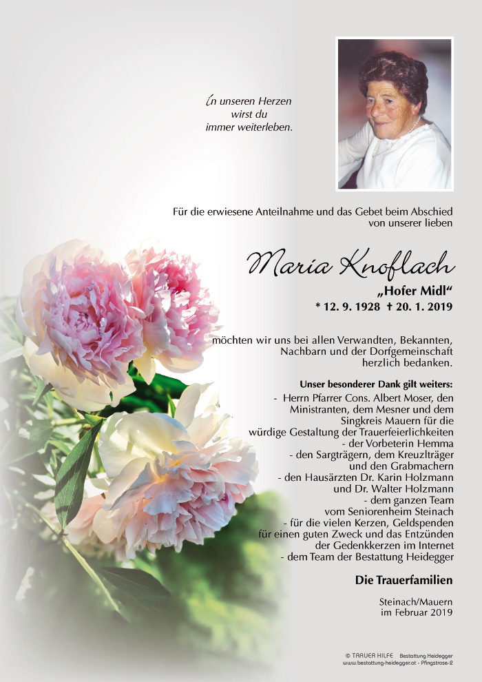 Bestattung wurde durchgeführt von: Karl Neurauter Karl Neurauter Bestattung Heidegger Brennerstraße 69 6150 - Steinach am Brenner Tel.: 05275 5211 zum Bestatter