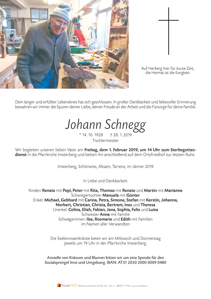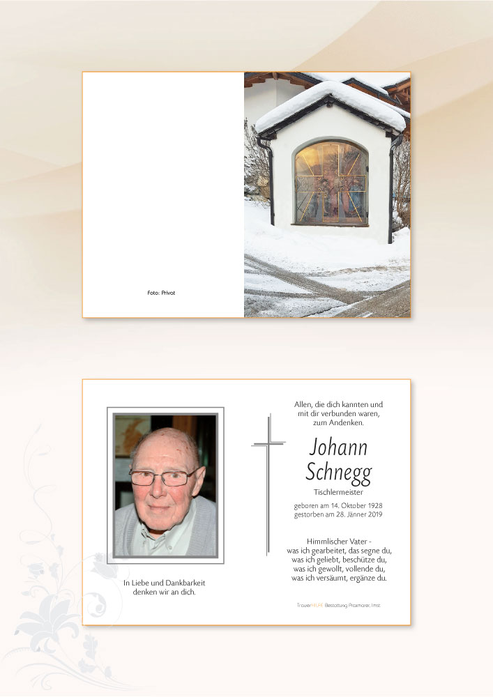 ich möchte Euch auf diesem Weg mein tiefes Mitgefühl aussprechen. Johann war mir ein sehr guter Lehrmeister und ein Vorbild. Ich glaube ganz viele Menschen werden den "Schnegg‘a Johann" immer als liebenswürdigen, freundlichen und gut gelauntes Original in Erinnerung behalten.