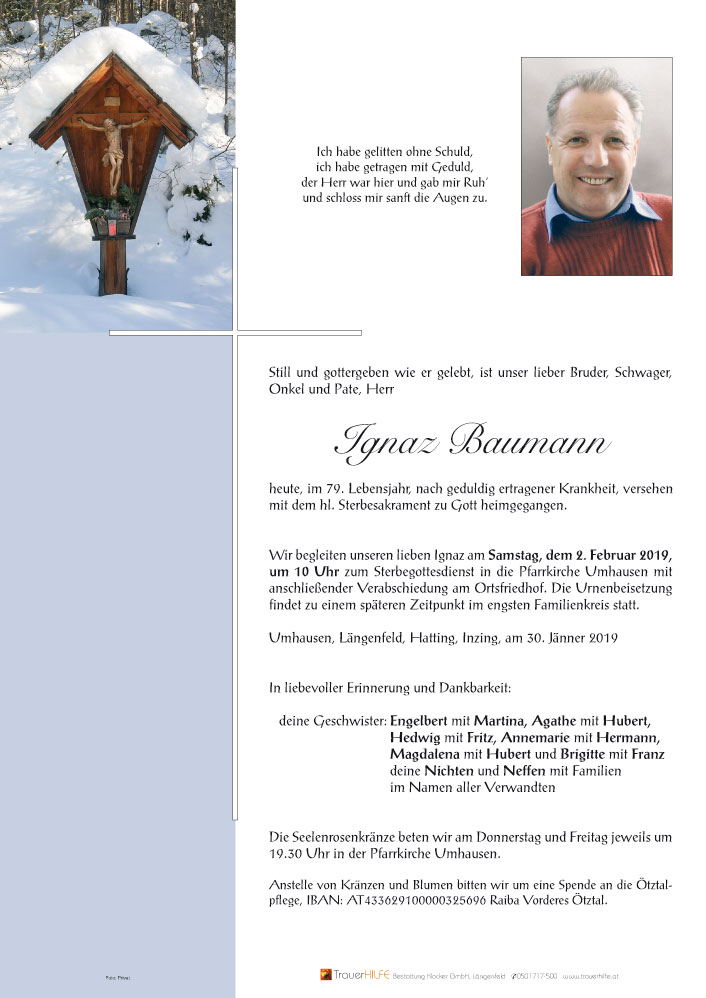 Aufrichtige Anteilnahme am Tode Eures lieben Ignaz entbieten Familie Scharfetter, Gasthof Andreas Hofer Umhausen.30.01.2019 22:11 - Familie Scharfetter