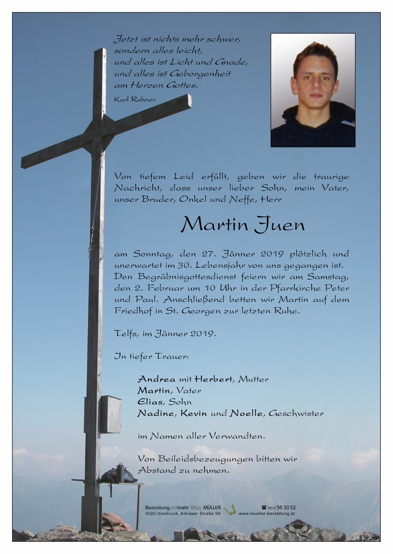 Bestattung wurde durchgeführt von: Mag. Martin Müller Concordia Bestattung 6020 - Innsbruck Reichenauer Str. 95 6060 - Hall i. T. Salzburger Str. 33 Tel.: 0512 34 34 33 Tel.: 05223 57 2 54 zum Bestatter