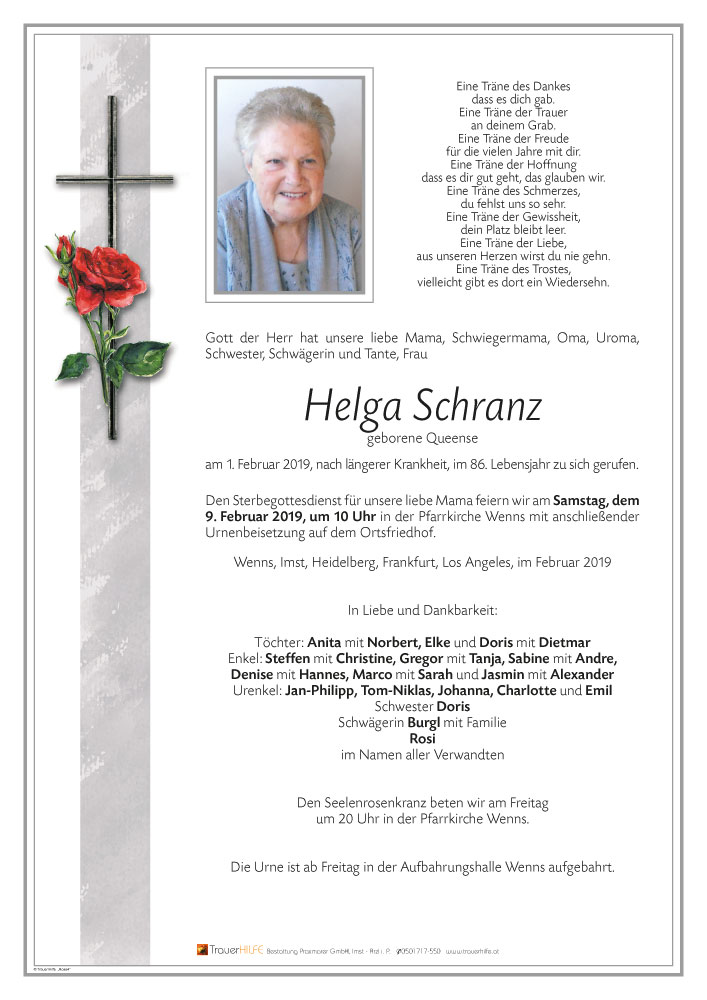 der ewigen Heimat zu. Ruhe in Frieden liebe Helga. In lieber Erinnerung Romana Neurauter ( Nichte von Dora Kugler) herzliche Anteilnahme an die Trauerfamilie02.02.2019 17:36 - Romana Neurauter