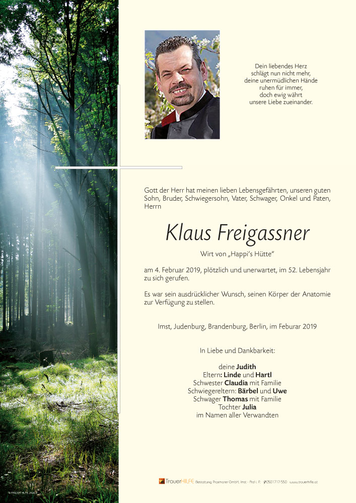 Erschrocken und mit großer Trauer erhielten wir die Nachricht, dass Klaus Freigassner plötzlich und viel zu früh von uns gegangen ist. Wir wünschen Judith, Familie, Freunden und Bekannten viel Kraft mit diesem großen Verlust.