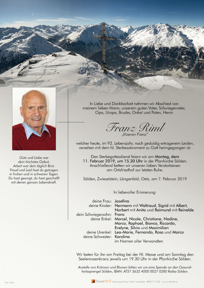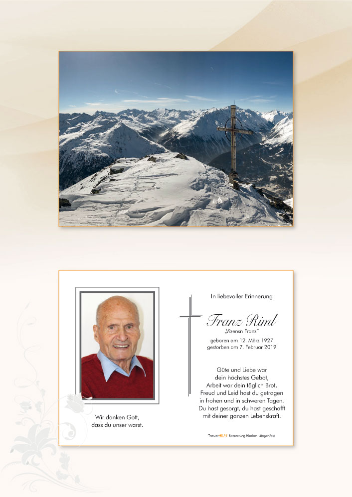 Liebe Fina und Kinder, letztes Jahr im Mai habe ich euch zwei noch mal im Altersheim in Sölden besorgt. Es waren ein paar nette Stunden und Ihr habt von früher erzählt. Franz du hattest ein erfülltes Leben mit deiner Fina und deinen Kindern . Du warst immer zufrieden und bescheiden. Jetzt sei es dir vergönnt dass du deine Ruhe findest. Grüss mir bitte meinen Vater und meine Mama . Ich werde für euch eine Kerze anzünden. und an früher denken und ab und zu ein wenig schmunzeln . Pfiat di Franz