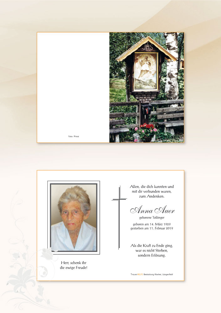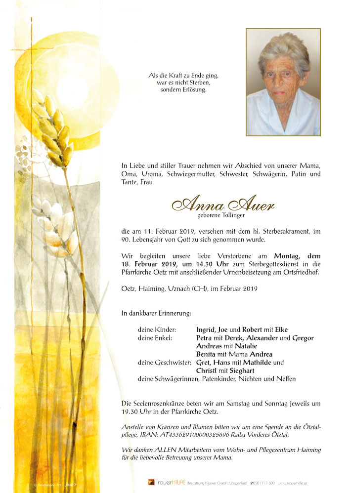 Nun ist der Tag und die Stunde des Abschiednehmens von Eurer lieben Mama und guten Oma gekommen. Ihr dürft darauf vertrauen, dass sie in eine wunderbare Begegnung mit unserem Herrgott gekommen ist.