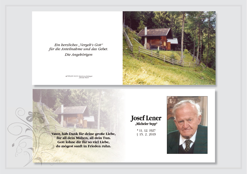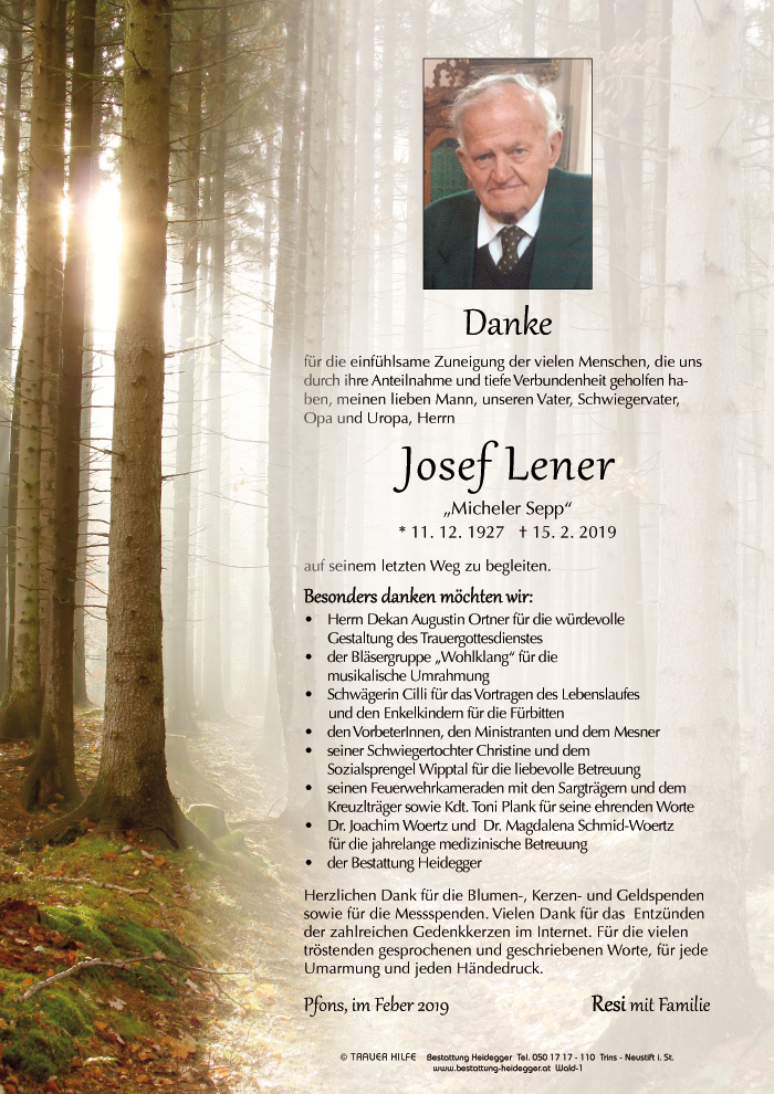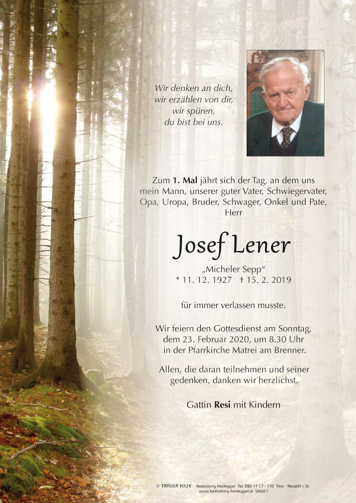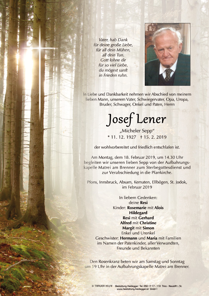 Bestattung wurde durchgeführt von: Karl Neurauter Karl Neurauter Bestattung Heidegger Brennerstraße 69 6150 - Steinach am Brenner Tel.: 05275 5211 zum Bestatter