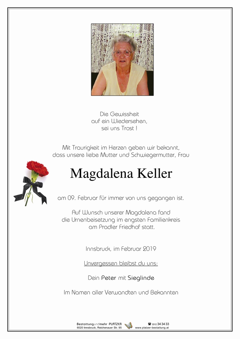 Bestattung wurde durchgeführt von: Mag. Martin Müller Concordia Bestattung 6020 - Innsbruck Reichenauer Str. 95 6060 - Hall i. T. Salzburger Str. 33 Tel.: 0512 34 34 33 Tel.: 05223 57 2 54 zum Bestatter