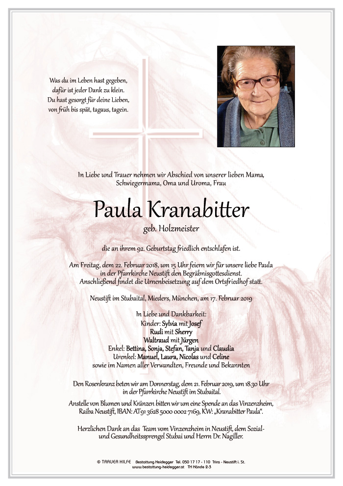 Neue Kerze für Paula Kranabitter entzünden.
