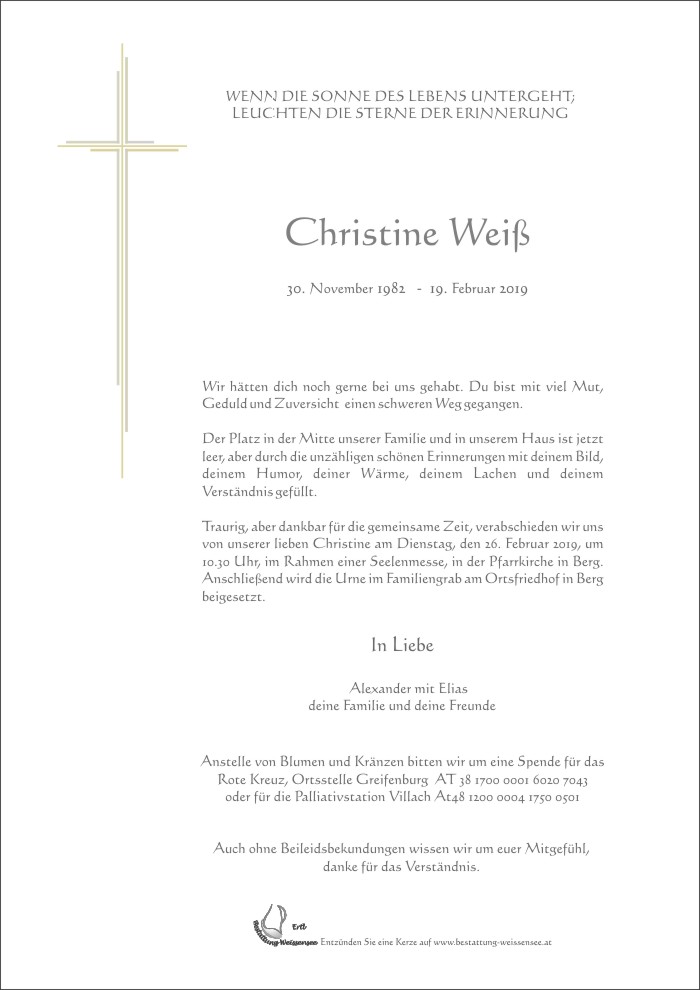 Mit Betroffenheit habe ich vom Todesfall von Christine erfahren. Ich möchte Euch von Herzen mein Beileid aussprechen und viel Kraft und alles Gute wünschen.