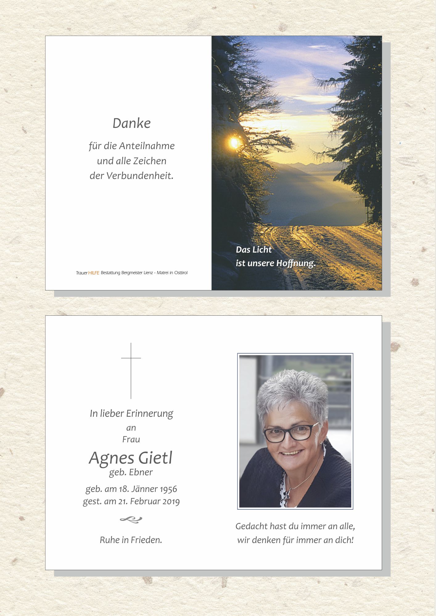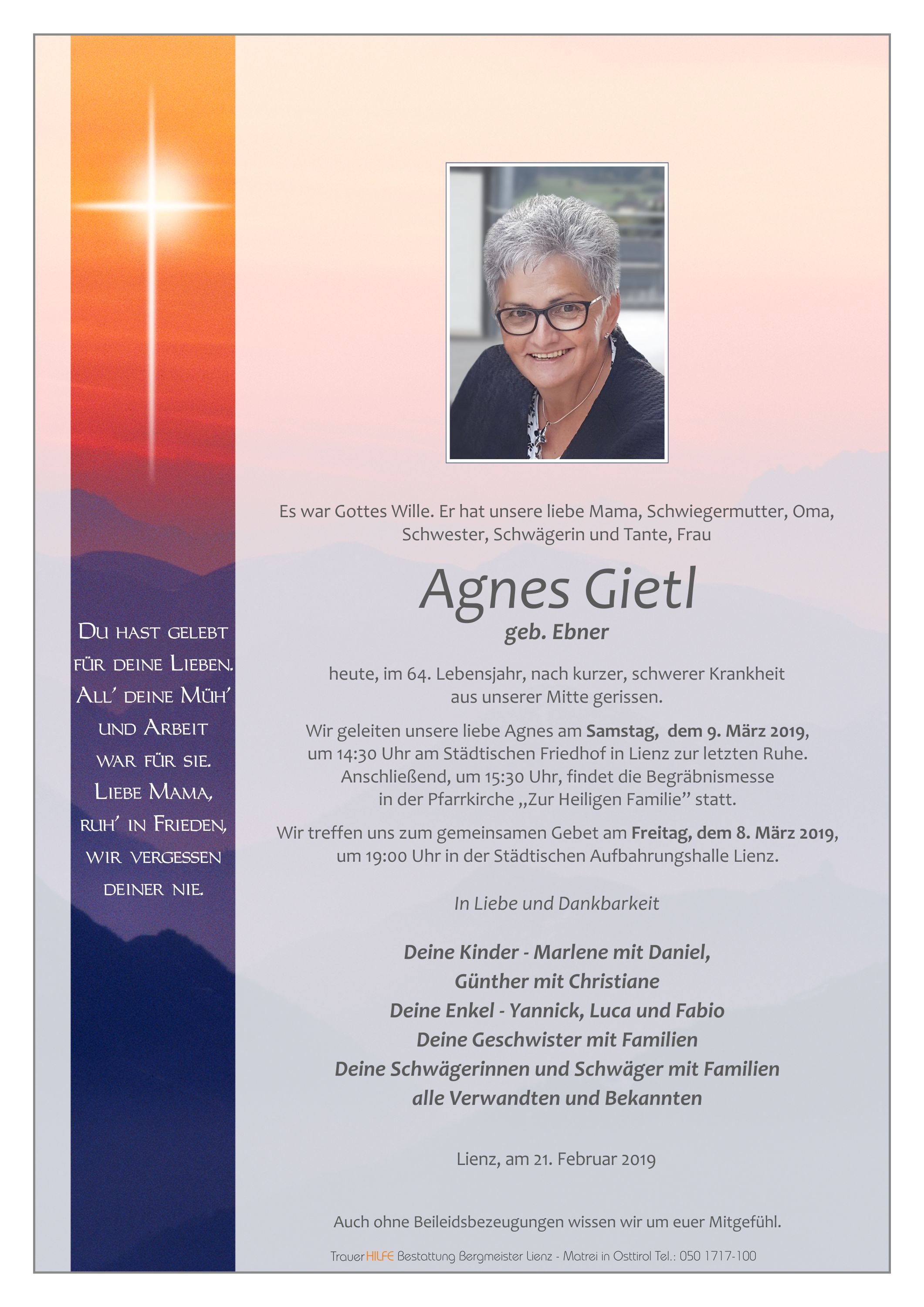 Liabe Agnes❤️ I bin unsågbår traurig,dass du schon gången bisch, wårsch a gånz a besonders wertvoller Mensch für unsere gånze Familie und des schon seit unserer Kindheit. Mir wårn soviel bei Niascha und es wår immer sou nett,danke dafür!! Wia unsa Florian verunglückt isch, håsche uns getröstet und mir håm wenn ma uns getroffn håm viel drüber gredet.Hetz bische selba af dem wunderschenen Platzl und von dort wearsch du zåm mitn Hermann af dei Familie aufpassn. Måch's guat und danke für dei Freundschaft❤️Gitta mit Familie