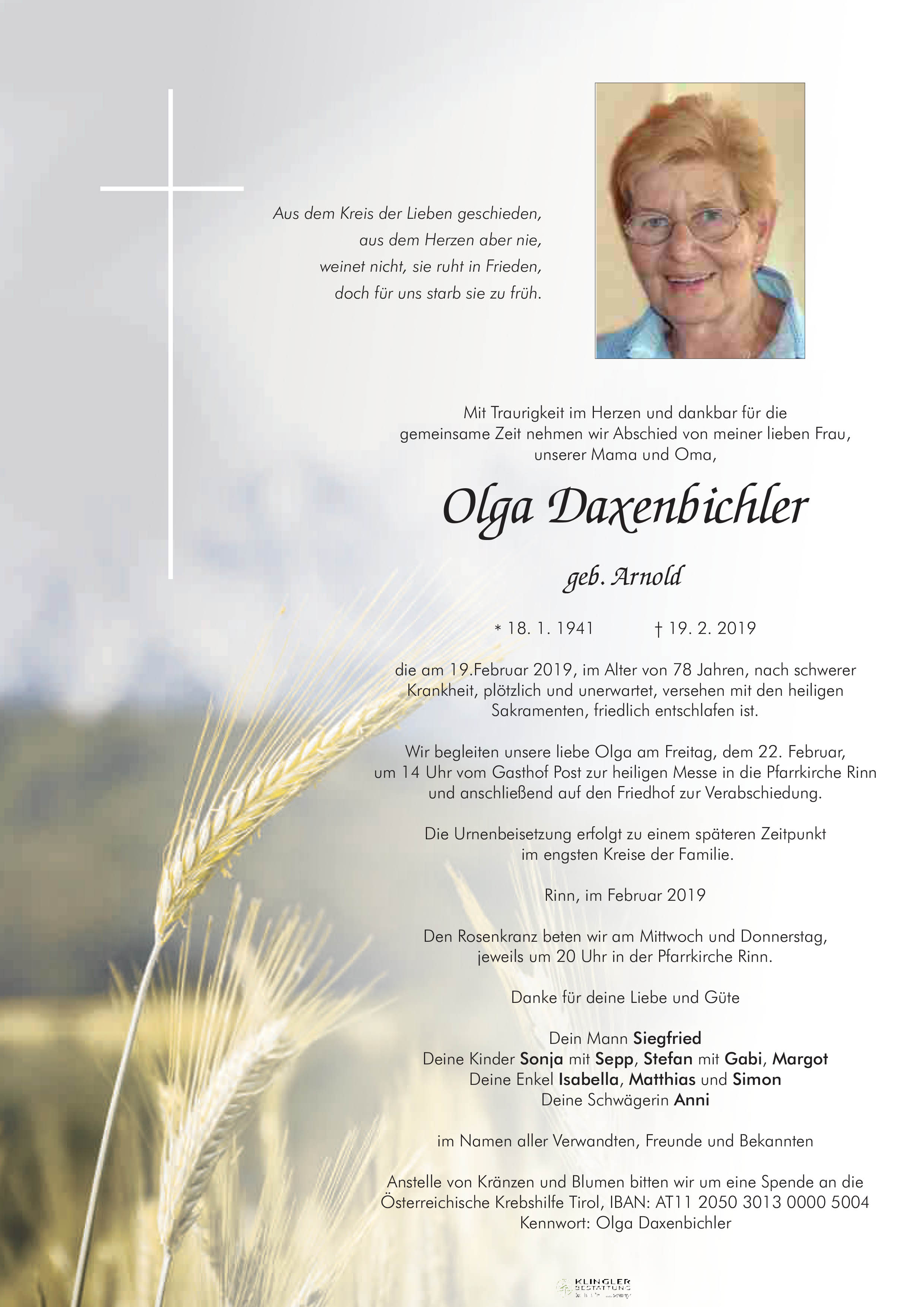 Bestattung wurde durchgeführt von: Mag. Martin Müller Concordia KLINGLER Bestattung Salzburger Straße 33 6060 - Hall in Tirol Tel.: 05223 57 25 40 zum Bestatter