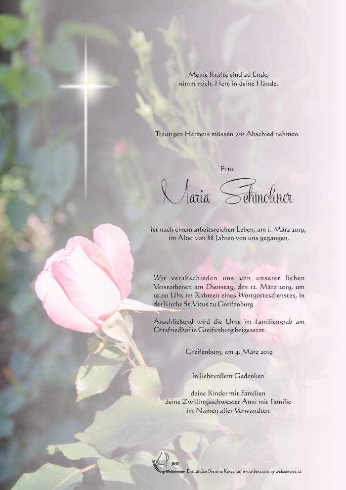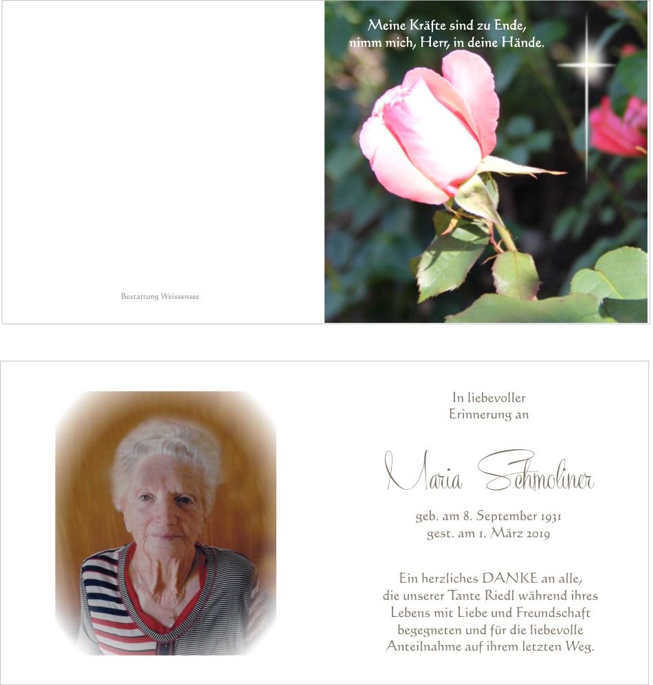 Auf diesem Wege spreche ich mein aufrichtiges Beileid an all ihre Angehörigen aus. Ich bin sehr dankbar, dass ich Frau Schmoliner ein Stück ihres Lebensweges begleiten durfte, ich habe dabei sehr viel gelernt.